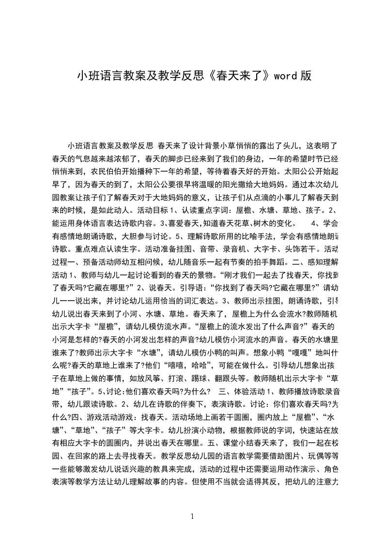 小班语言教案及教学反思 春天来了设计背景小草悄悄的露出了头儿,这表明了春天的气息越来越浓郁了,春天的脚步已经来到了我们的身边,一年的希望时节已经悄悄来到,农民伯伯开始播种下一年的希望,等待着春天好的开始。太阳公公开始起早了,因为春天的到了,太阳公公要很早将温暖的阳光撒给大地妈妈。通过本次幼儿园教案让孩子们了解春天对于大地妈妈的意义,让孩子们从点滴的小事儿了解春天到来的时候,是如此动人。活动目标