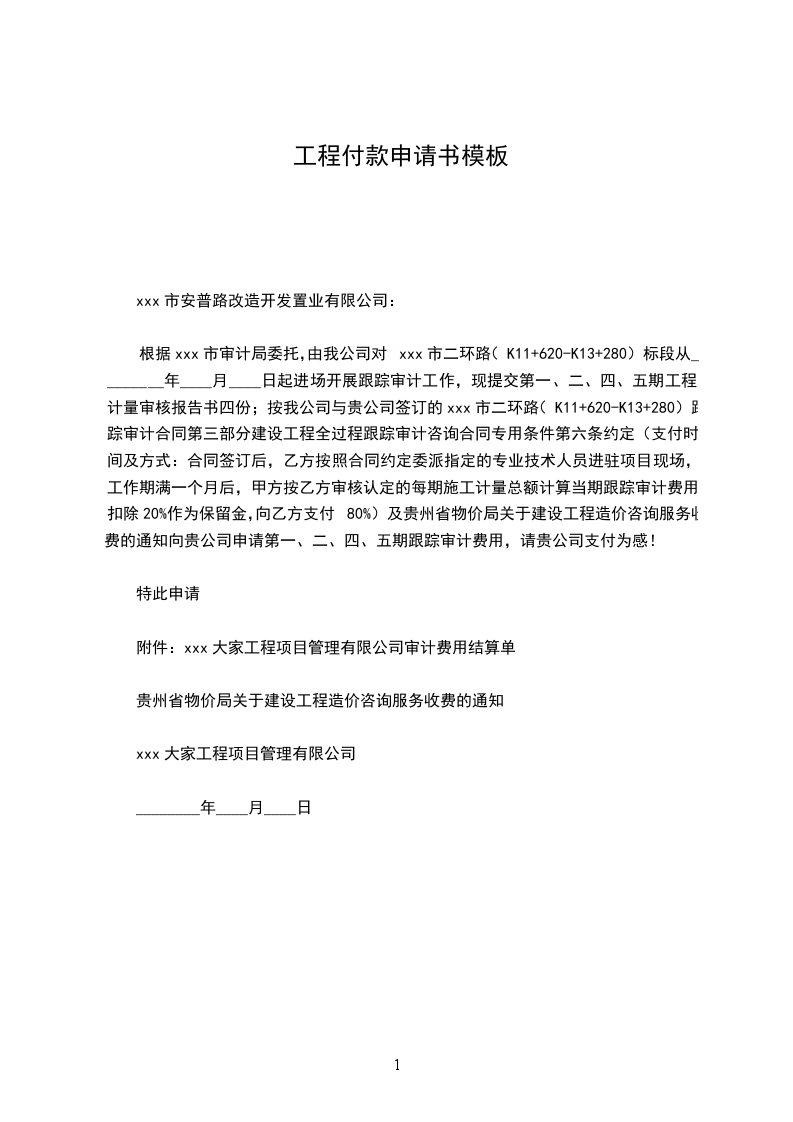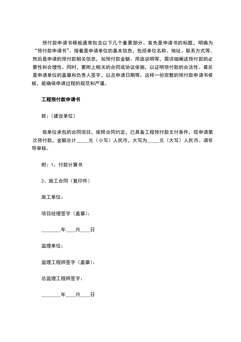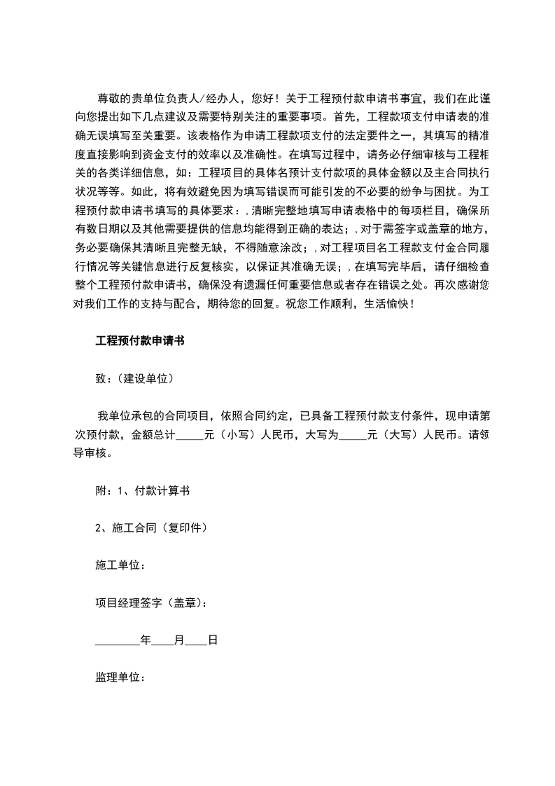 我公司承建贵司xxx项目,并已和贵司签订《xxxx合同》,根据该合同xxxx条款规定“xxxx”,特此向贵司提出支付预付款申请。
