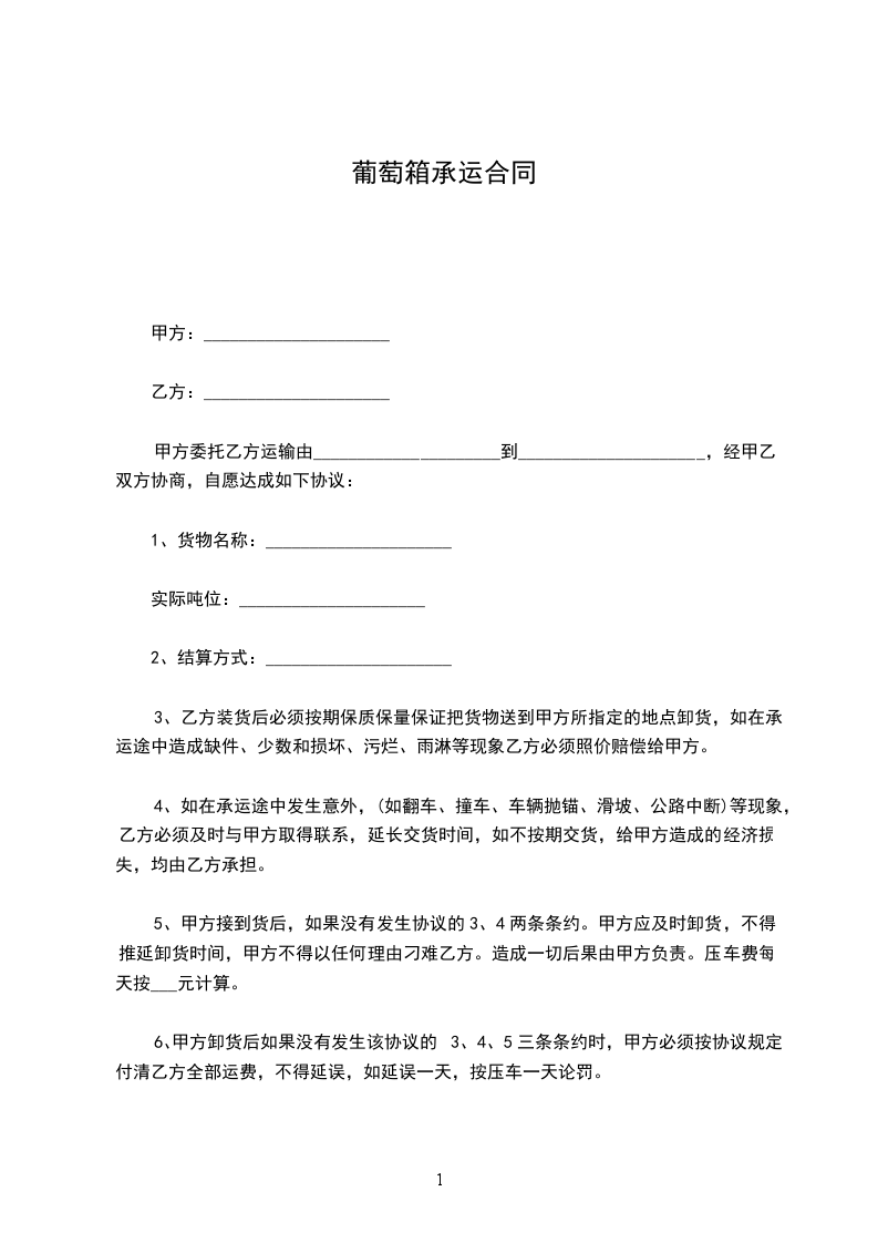 6、甲方卸货后如果没有发生该协议的3、4、5三条条约时,甲方必须按协议规定付清乙方全部运费,不得延误,如延误一天,按压车一天论罚。