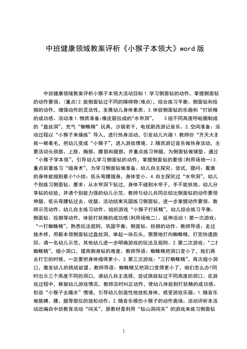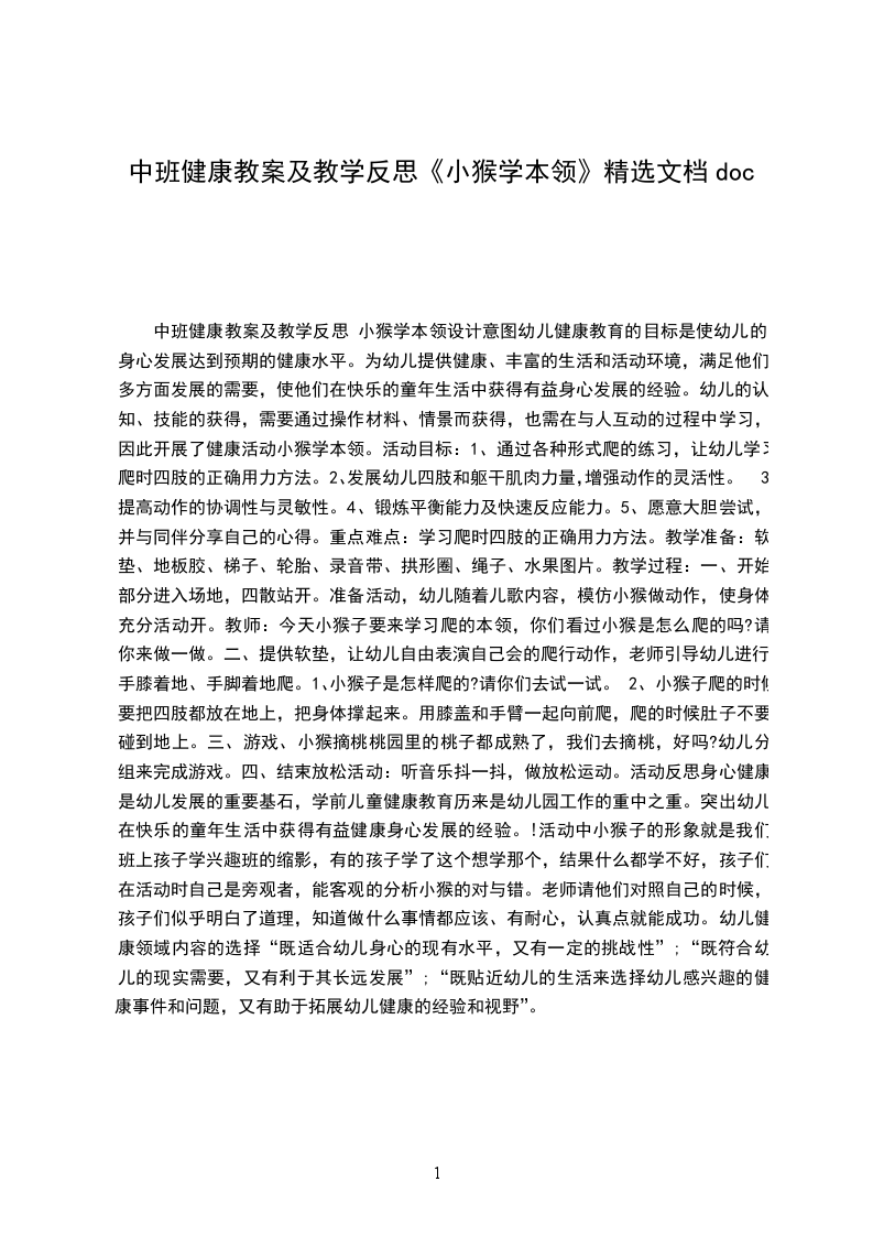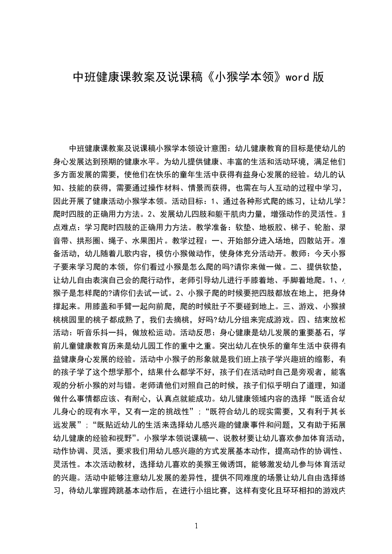 中班健康课教案及说课稿小猴学本领设计意图:幼儿健康教育的目标是使幼儿的身心发展达到预期的健康水平。为幼儿提供健康、丰富的生活和活动环境,满足他们多方面发展的需要,使他们在快乐的童年生活中获得有益身心发展的经验。幼儿的认知、技能的获得,需要通过操作材料、情景而获得,也需在与人互动的过程中学习,因此开展了健康活动小猴学本领。活动目标: