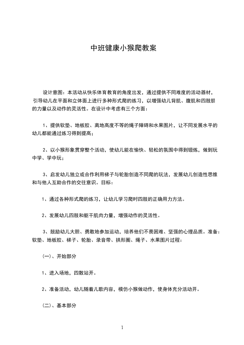 一、开始部分进入场地,四散站开。准备活动,幼儿随着儿歌内容,模仿小猴做动作,使身体充分活动开。教师:今天小猴子要来学习爬的本领,你们看过小猴是怎么爬的吗?请你来做一做。