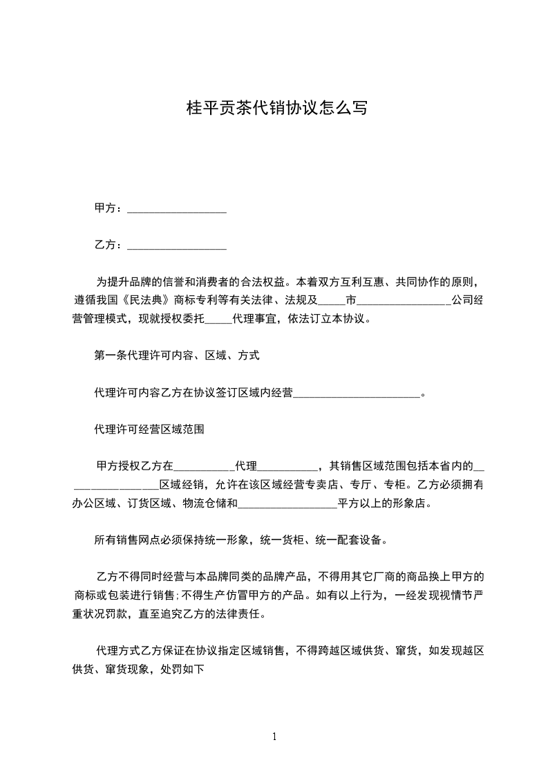1.甲方授权乙方在规定的销售区域经销_________________品牌专卖、专厅、专柜的产。