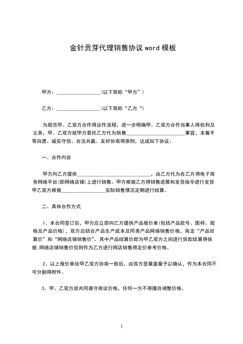 1、乙方同意在经营范围内销售甲方经营的____________________产品,并向甲方提供营业执照副本的复印件、法定代表人身份证明及相关资质文件。