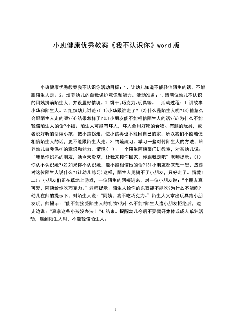 (一):一个陌生阿姨敲门进教室,对某幼儿说:“我是你妈妈的朋友,她今天没空,让我来接你回家,你跟我走吧”老师提示: