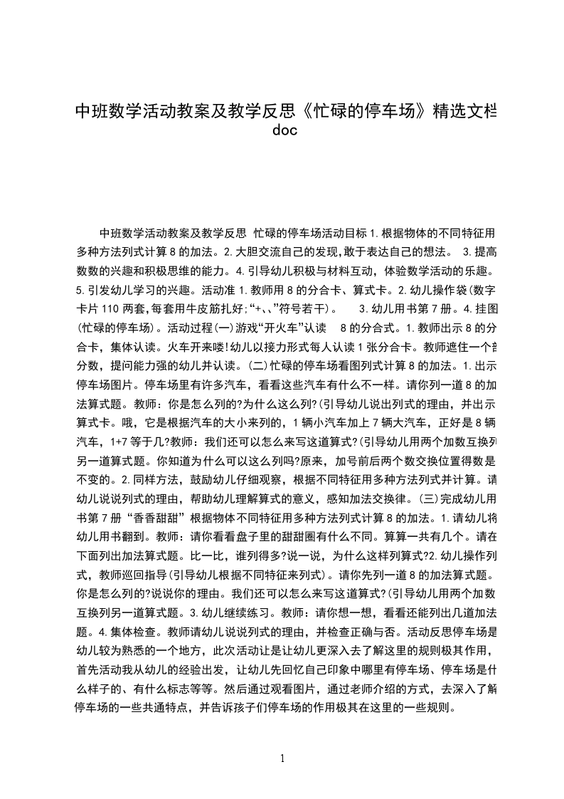 4.集体检查。教师请幼儿说说列式的理由,并检查正确与否。活动反思停车场是幼儿较为熟悉的一个地方,此次活动让是让幼儿更深入去了解这里的规则极其作用,首先活动我从幼儿的经验出发,让幼儿先回忆自己印象中哪里有停车场、停车场是什么样子的、有什么标志等等。然后通过观看图片,通过老师介绍的方式,去深入了解停车场的一些共通特点,并告诉孩子们停车场的作用极其在这里的一些规则。