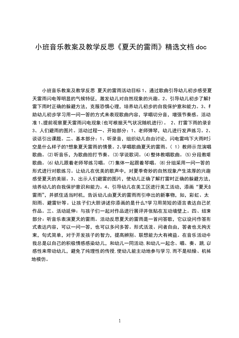 四、结束部分:听音乐表演夏天的雷雨。活动反思夏天的雷雨是一首问答歌,它以设问作答形式表达内容,可以一问一答,也可以多问多答。形式活泼、问者自由,答者也无拘无束,句式简单,对于开发孩子的智力,提高辨别、联想能力大有裨益。在音乐活动中我总是以自己的积极情感感染幼儿,和幼儿一同活动,和幼儿一起念、唱、奏、跳,以感性来带动幼儿,避免了纯理性的传授,使幼儿能主动地参与学习,而不是枯燥、机械地模仿。