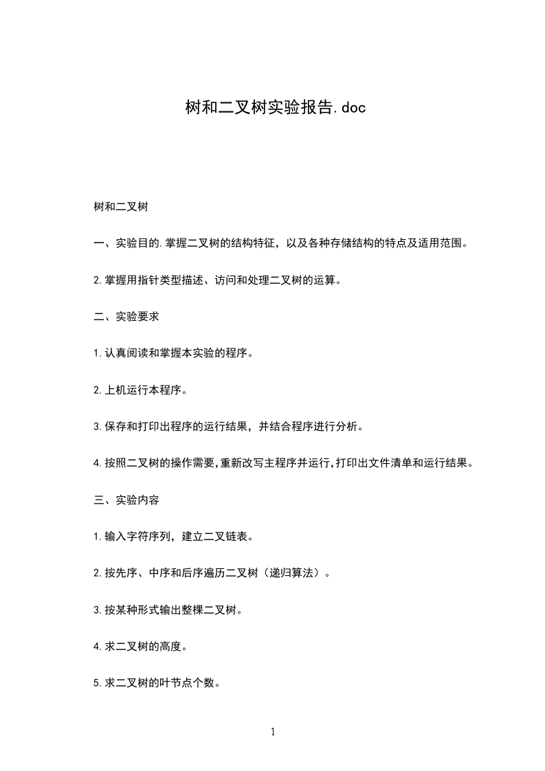 2、理解和掌握二叉树的各种基本数据结构的定义、存储结构和相应的算法,并能够用C语言实现。3、理解排序二叉树的建立过程。