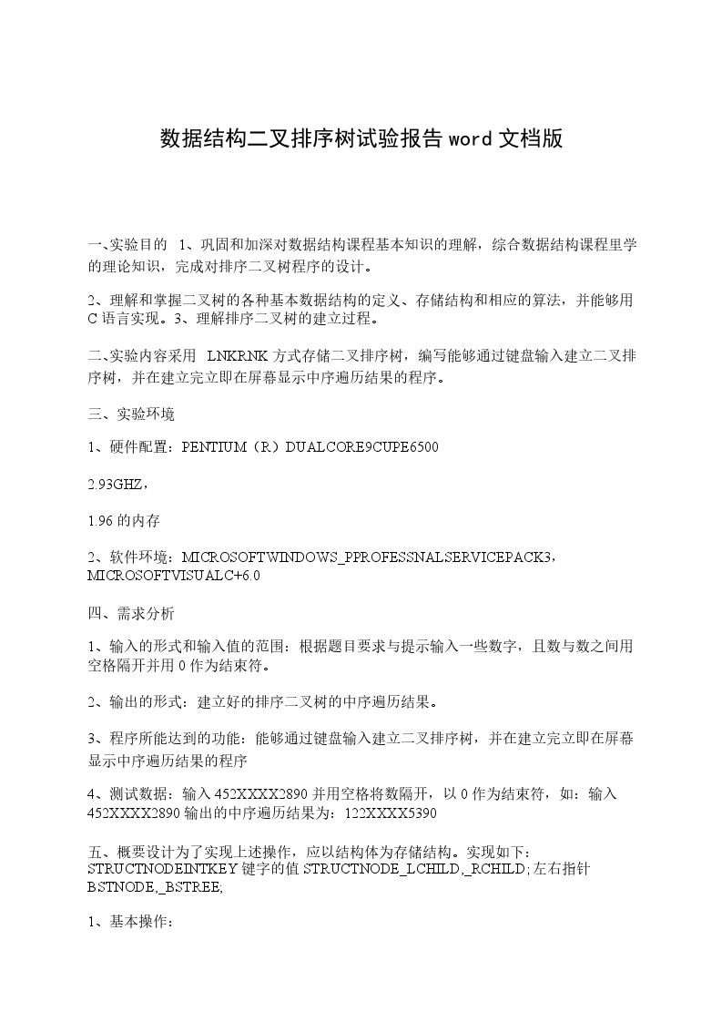 五、概要设计为了实现上述操作,应以结构体为存储结构。实现如下:STRUCTNODEINTKEY键字的值STRUCTNODE_LCHILD,_RCHILD;左右指针BSTNODE,_BSTREE;