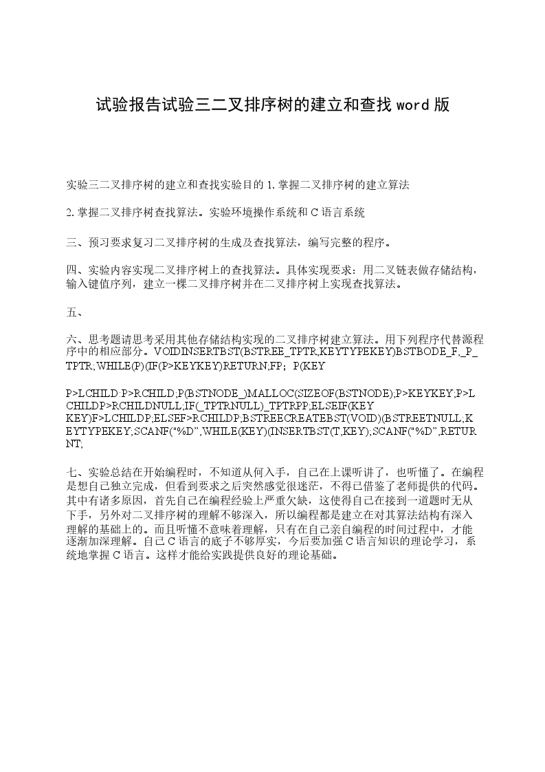 (2)创建二叉排序树函数模块VOIDCREATEBST(BSTREE_BST)INTKEY;_BSTNULL;SCANF("%D",WHILE(KEY!0)INSERTBST(BST,KEY);SCANF("%D",二叉排序树的插入结点函数模块VOIDINSERTBST(BSTREE_BST,INTKEY)BSTREES;IF(_BSTNULL)S(BSTREE)MALLOC(SIZEOF(BSTNODE);S>KEYKEY;S>LCHILDNULL;S>RCHILDNULL;_BSTS;ELSEIF(KEY<(_BST)>KEY)INSERTBST((_BST)>LCHILD),KEY);将S插入左子串ELSEIF(KEY>(_BST)>KEY)INSERTBST((_BST)>RCHILD),KEY);将S插入右子串递归法中序遍历二叉排序树VOIDINORDER(BSTREEBT)IF(BT!NULL)INORDER(BT>LCHILD);PRINTF("%3D",BT>KEY);INORDER(BT>RCHILD);3)函数调用关系图MAIN()CREATEBST(BSTREE_BST)INSERTBST(BSTREE_BST,INTKEY)INORDER(BSTREEBT)