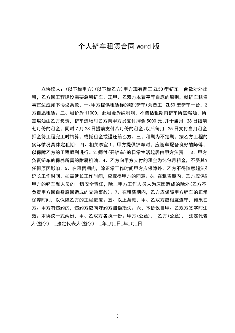 立协议人:(以下称甲方)(以下称乙方)甲方现有晋工ZL50型铲车一台欲对外出租,乙方因工程建设需要急租铲车,现甲、乙双方本着平等自愿的原则,就铲车租赁事宜达成如下协议条款: