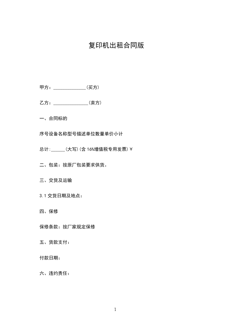 一、甲方提供复印机供乙方使用,品牌为,型号为,底数为张。租期为一年或以上。如乙方提前退机,乙方须付甲方人工、车费及复印机损耗。