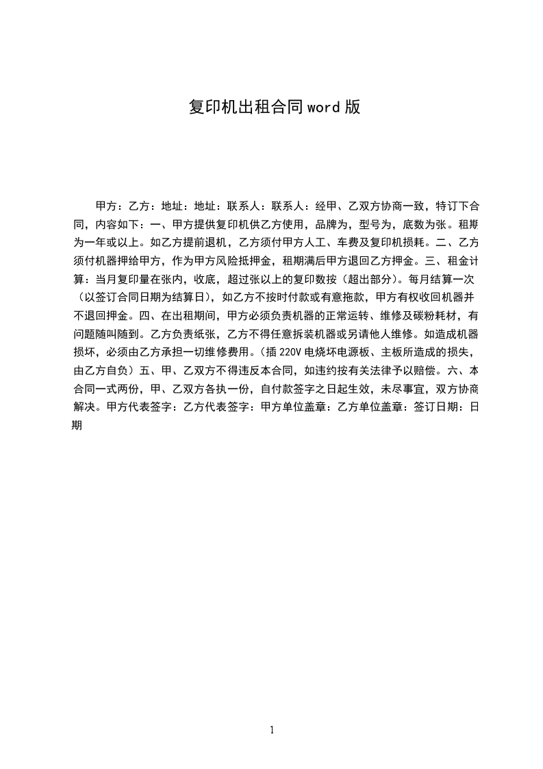 出租复印机合同甲方:_乙方:_日期:_出租复印机合同甲方:乙方:地址:地址:联系人:联系人:经甲、乙双方协商一致,特订下合同,内容如下:
