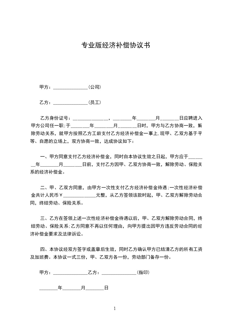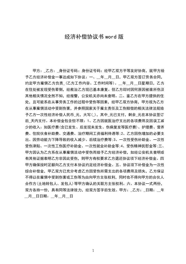 甲方:_乙方:_身份证号码:身份证号码:经甲乙双方平等友好协商,就甲方给予乙方经济补偿金一事达成如下协议:
