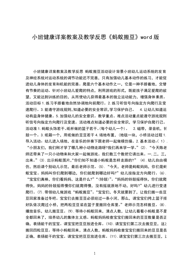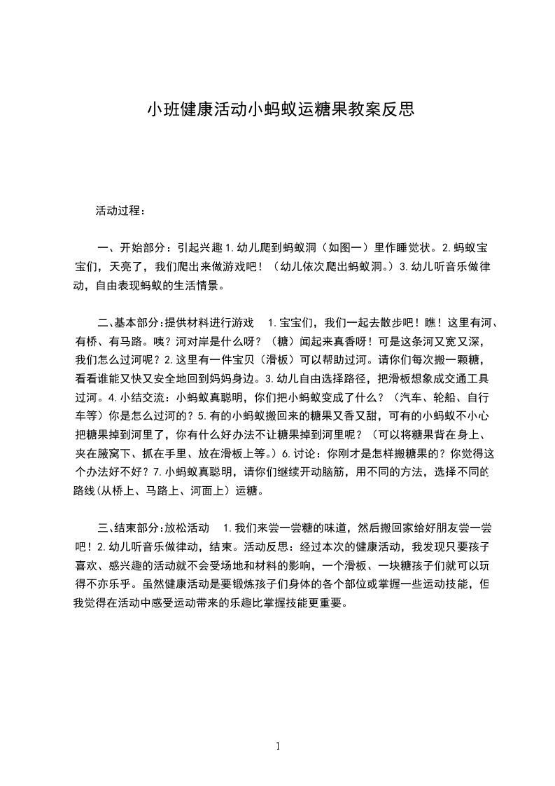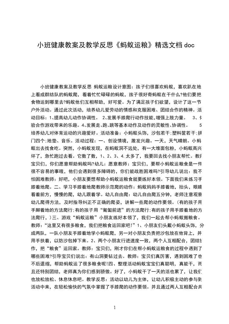 小班健康教案及教学反思 蚂蚁运粮设计意图:孩子们很喜欢蚂蚁,喜欢趴在地上看成群结队的蚂蚁爬,看着忙忙碌碌的蚂蚁,孩子很好奇蚂蚁在干什么?他们要把食物运到哪里去?蚂蚁他们互相帮助,好可爱。为了满足孩子们欲望,设计了这一节户外活动。通过此次活动,培养幼儿爱劳动的情感和克服困难、团结合作的精神。活动目标: