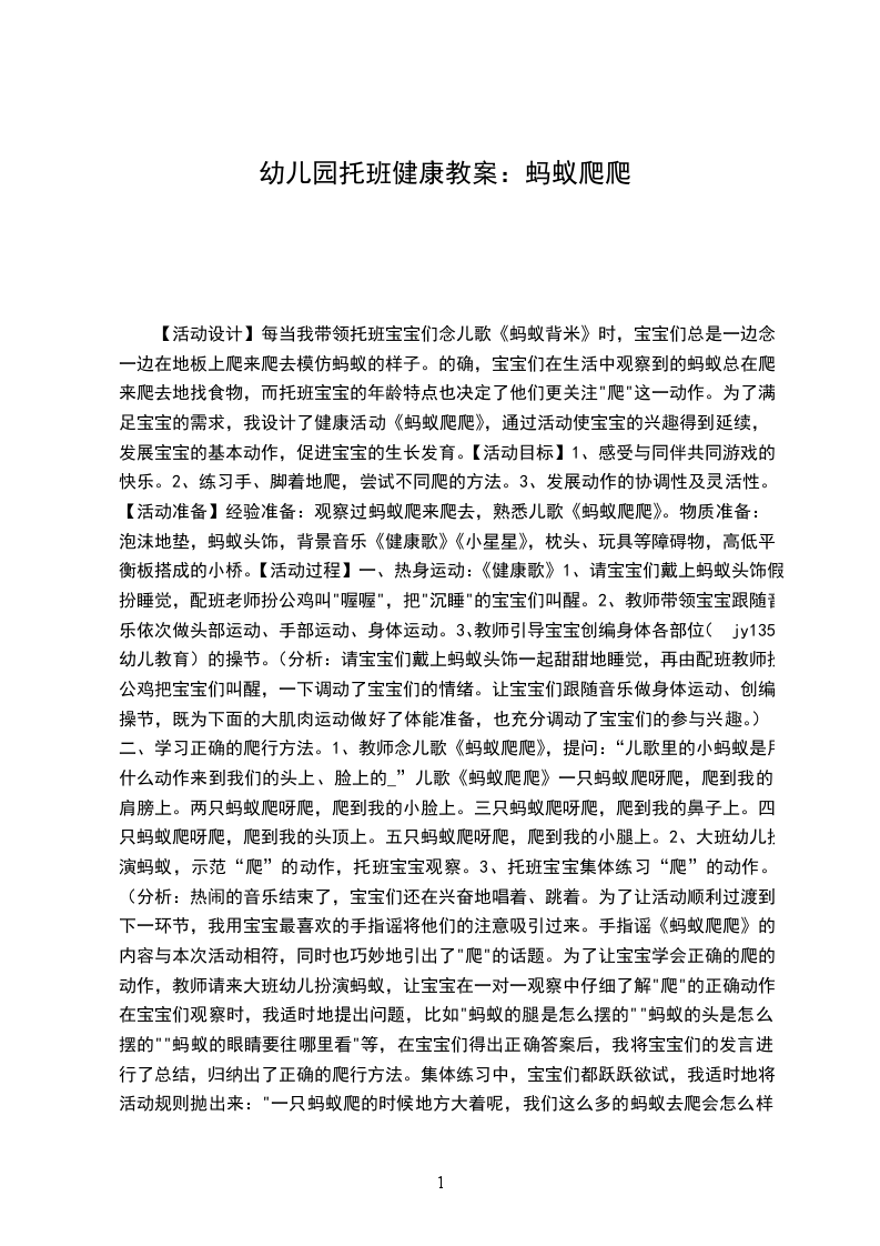 二、学习手膝着地爬教师示范爬的动作:蚂蚁妈妈手膝着地,抬头,眼睛看着前方,慢慢的爬,幼儿跟着学。幼儿自由爬:幼儿自由爬五分钟,老师注意观察幼儿爬得方法,及时指导纠正不正确的爬姿,讲解一些爬的动作要领。(有的孩子用手脚着地的方法爬行;有的孩子用“匍匐前进”的方法爬行;有的孩子用手膝着地的方法爬行,)