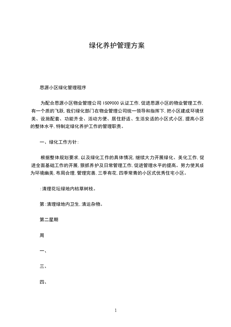 3.2绿化员日工作程序3.2.1循视检查:每天需对所管辖绿化区域循视检查一遍,填写绿化工作日记检查要点:观察植物病虫害及发展情况。了解地栽植物,盆栽花卉以及室内观叶植物的浇水情况,尤其是夏冬季浇水情况。观察花草、树木是否有枯枝败叶,花台、花境、花钵是否有杂草。观察植物长势,对绿篱过长作定期修剪计划,对长势不良植物作出补施肥计划,并及时执行。观察绿化区域的边角,对绿化死角作定期整改计划。雨天时注意观察地栽及盆栽植物是否出现积水现象,以及植株是否显倒伏状,并及时处理。对草坪的观察要注意草坪的杂草、病虫害、草坪长势、草坪的补种及修剪。根据循视检查结果,及时进行整改。