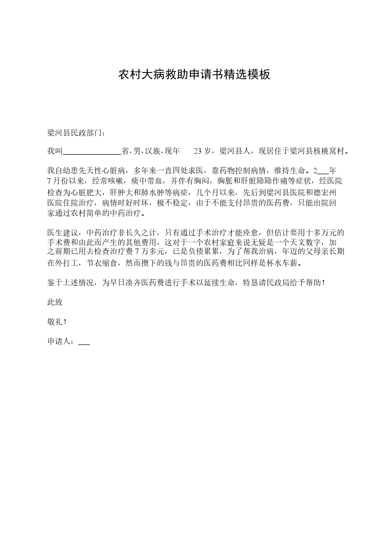 农村大病救助申请书篇二