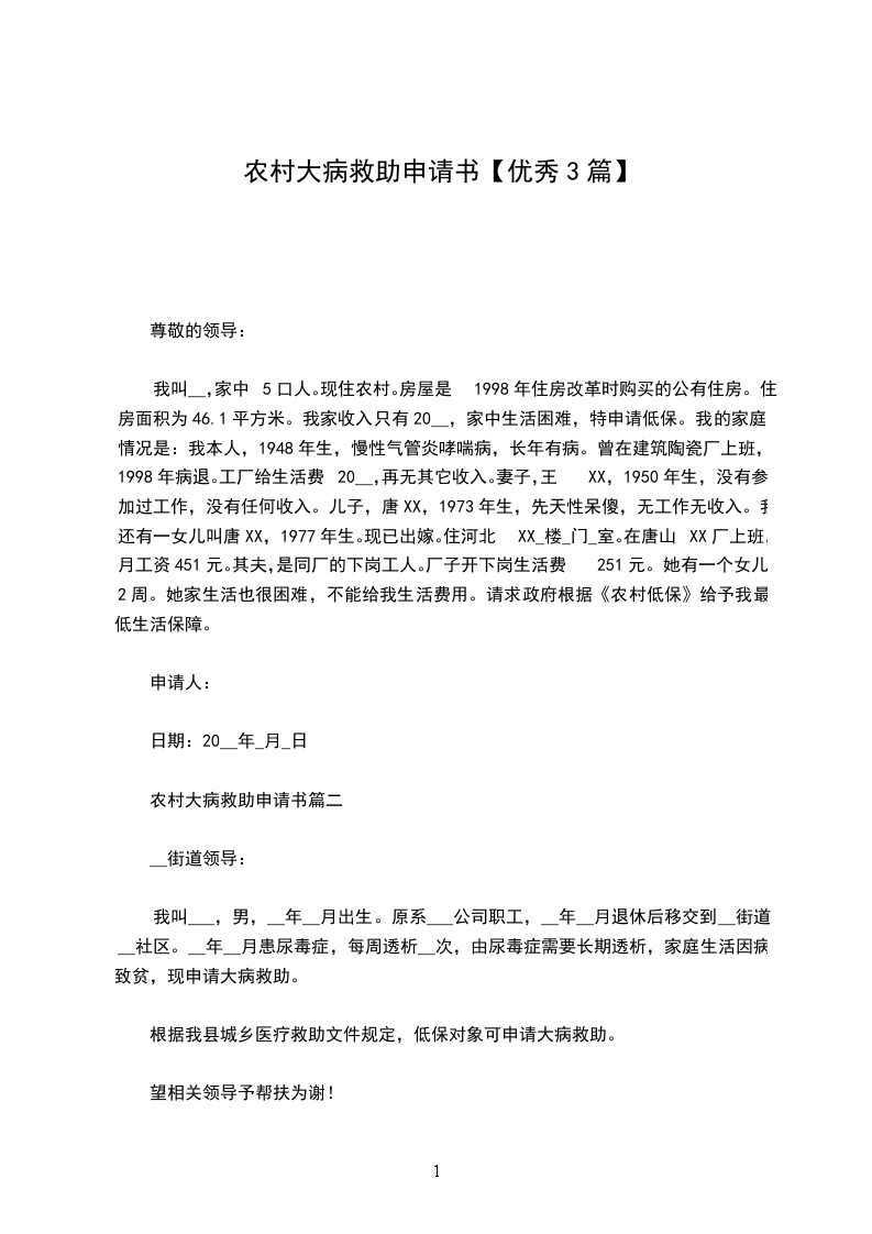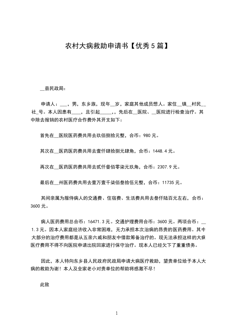 农村大病救助申请书篇三
