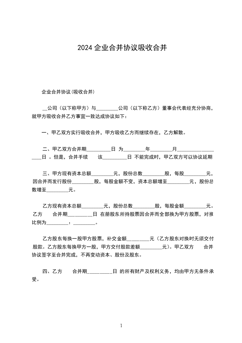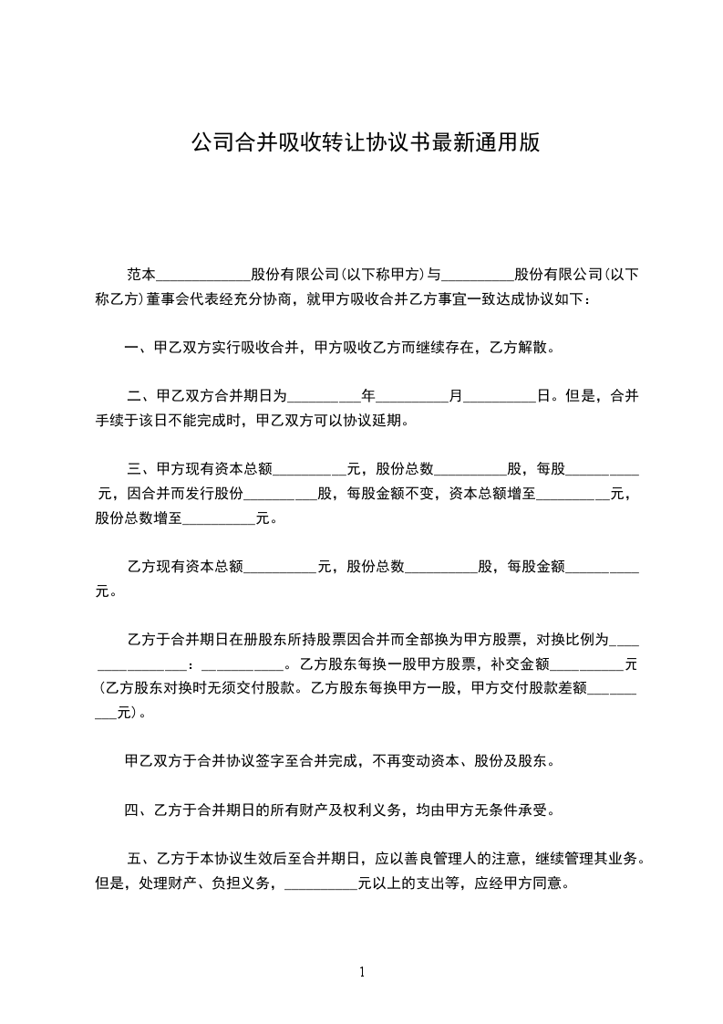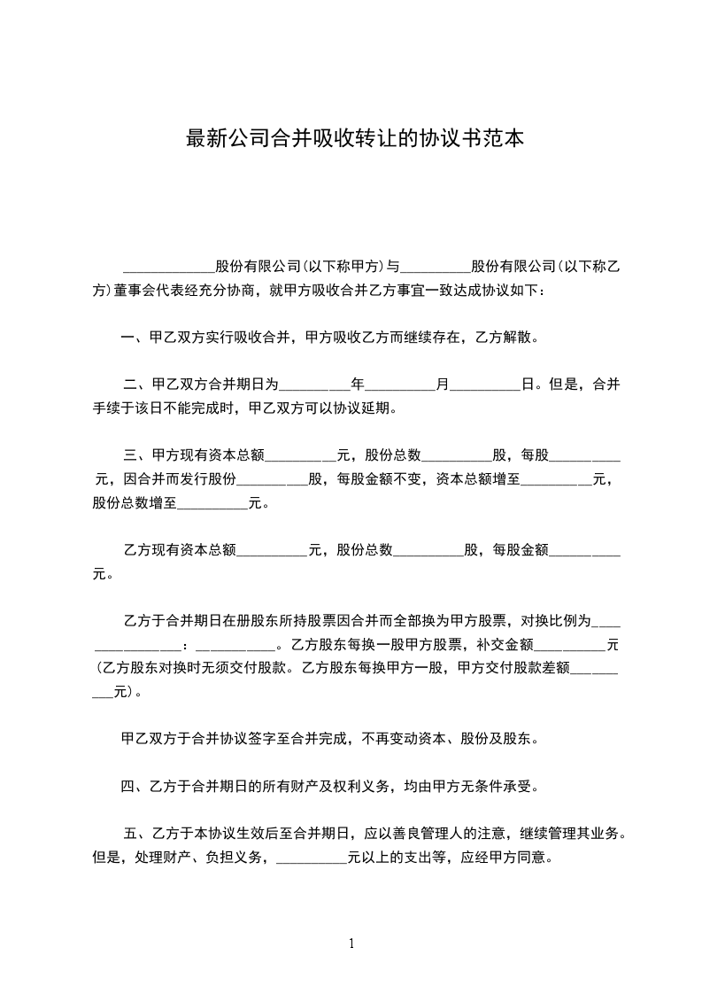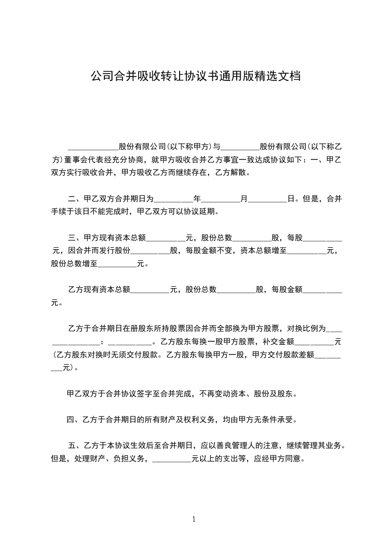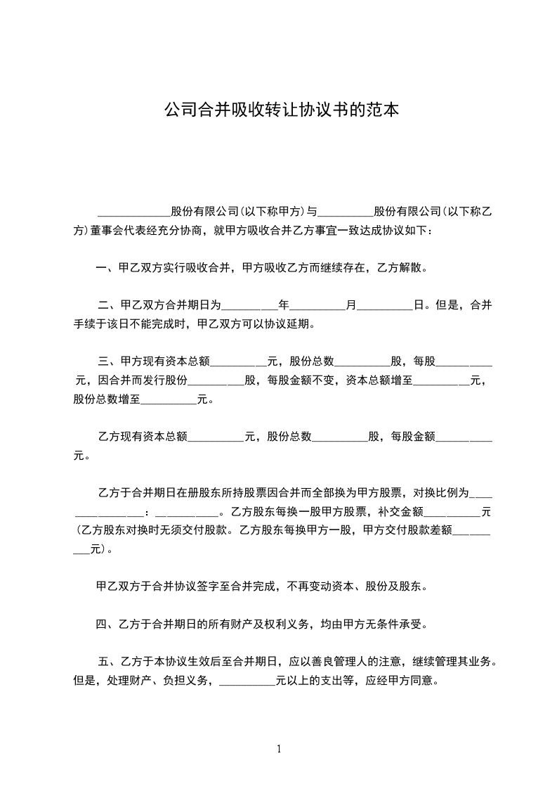 范本_____________股份有限公司(以下称甲方)与__________股份有限公司(以下称乙方)董事会代表经充分协商,就甲方吸收合并乙方事宜一致达成协议如下: