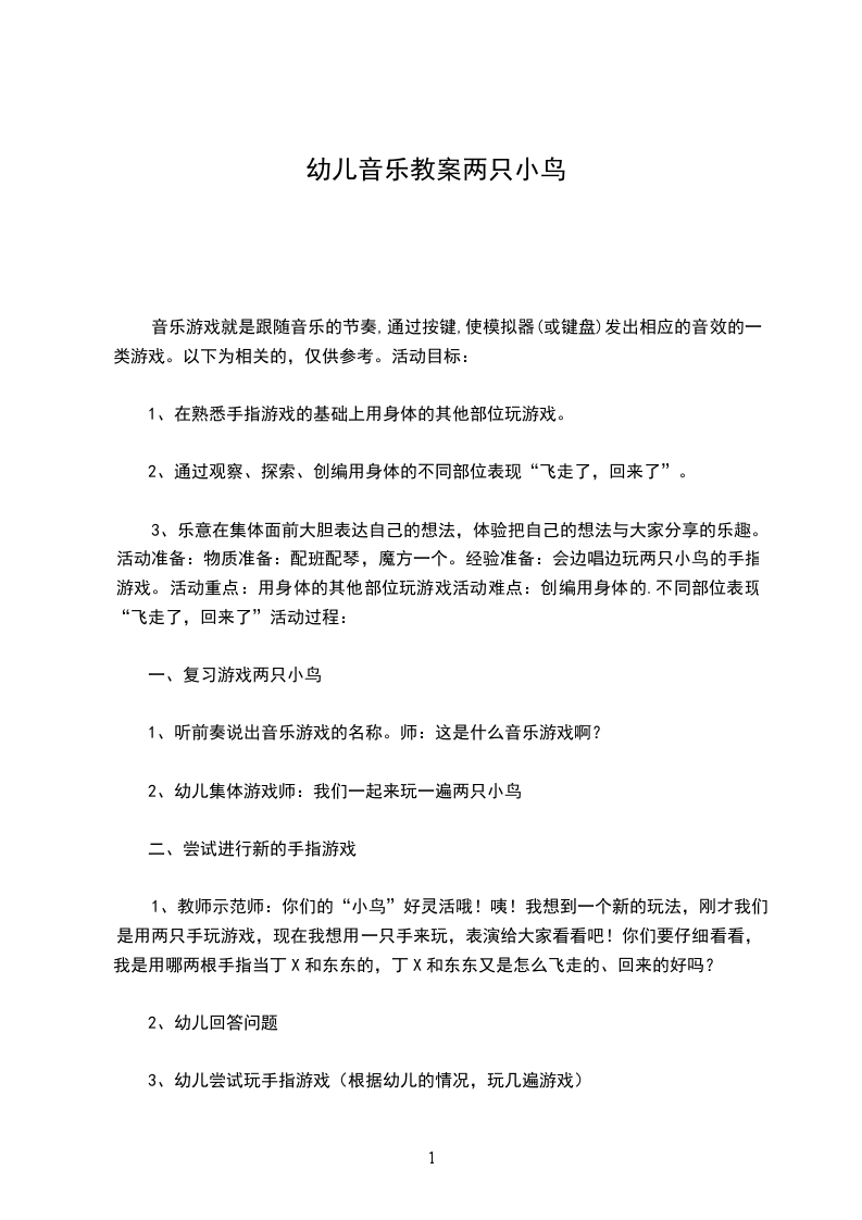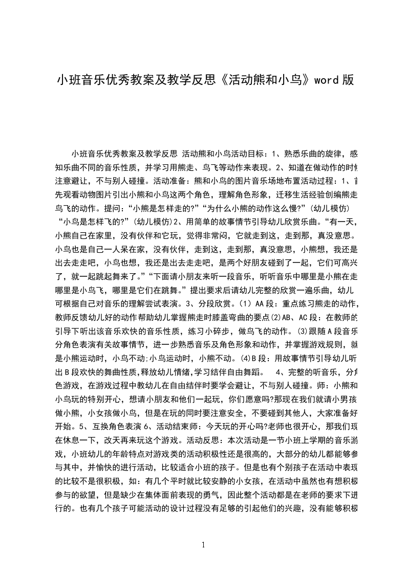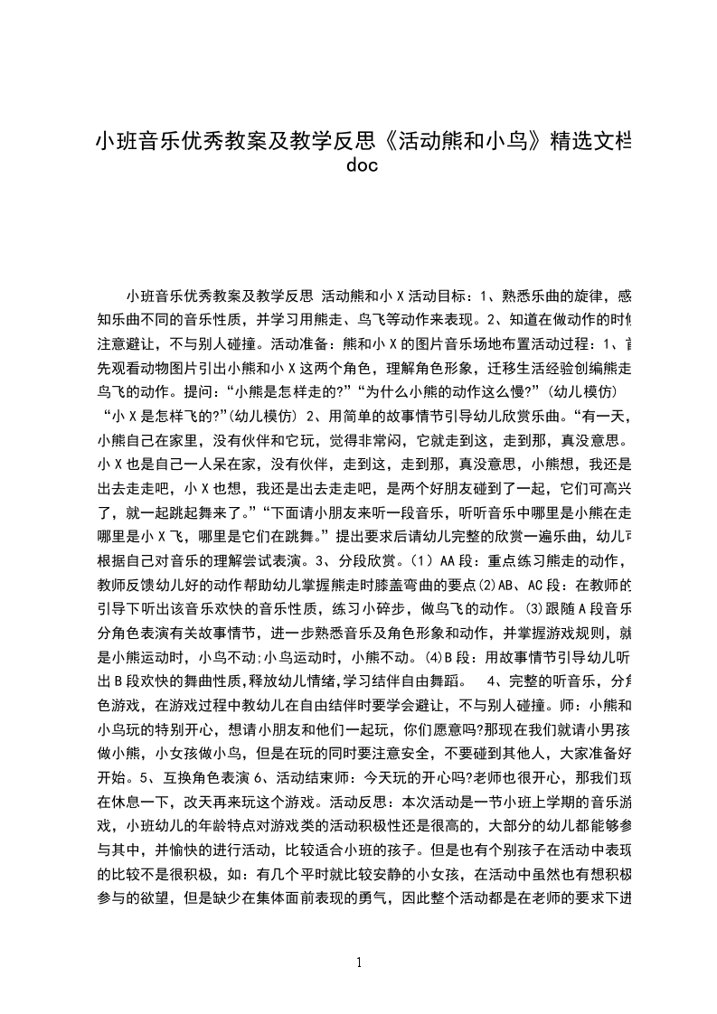 4、完整的听音乐,分角色游戏,在游戏过程中教幼儿在自由结伴时要学会避让,不与别人碰撞。师:小熊和小鸟玩的特别开心,想请小朋友和他们一起玩,你们愿意吗?那现在我们就请小男孩做小熊,小女孩做小鸟,但是在玩的同时要注意安全,不要碰到其他人,大家准备好,开始。