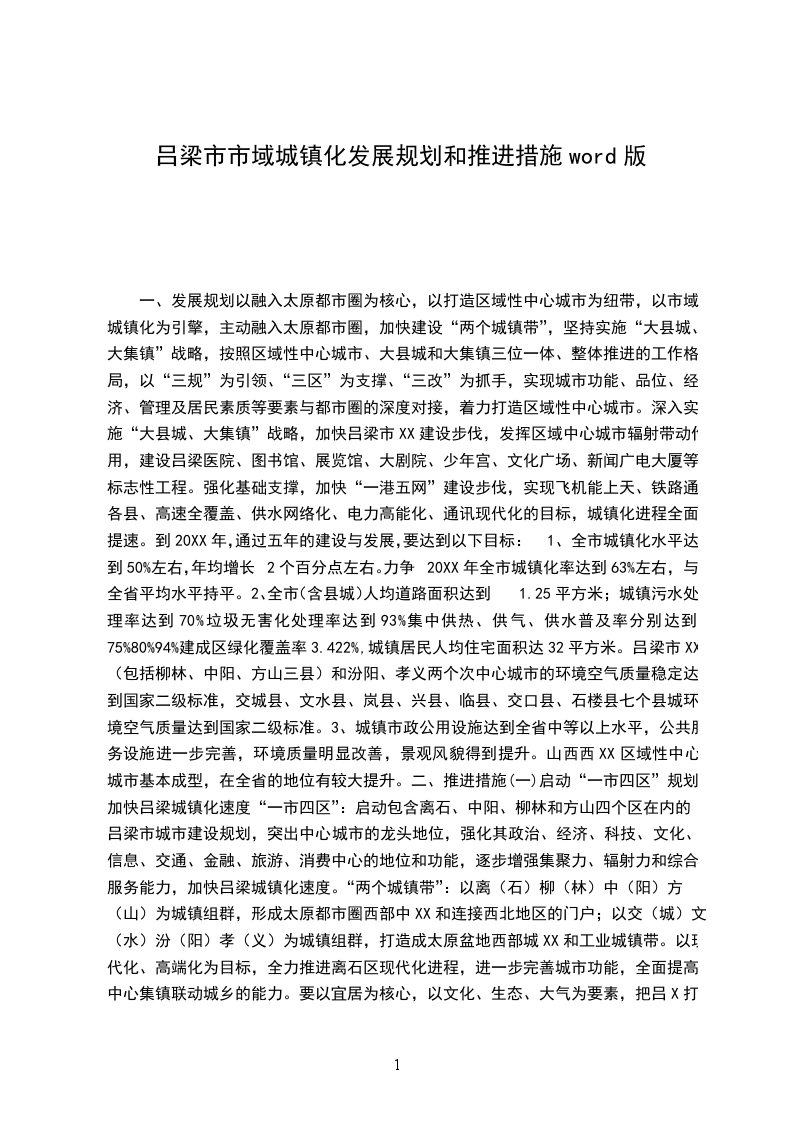 一、发展规划以融入太原都市圈为核心,以打造区域性中心城市为纽带,以市域城镇化为引擎,主动融入太原都市圈,加快建设“两个城镇带”,坚持实施“大县城、大集镇”战略,按照区域性中心城市、大县城和大集镇三位一体、整体推进的工作格局,以“三规”为引领、“三区”为支撑、“三改”为抓手,实现城市功能、品位、经济、管理及居民素质等要素与都市圈的深度对接,着力打造区域性中心城市。深入实施“大县城、大集镇”战略,加快吕梁市XX建设步伐,发挥区域中心城市辐射带动作用,建设吕梁医院、图书馆、展览馆、大剧院、少年宫、文化广场、新闻广电大厦等标志性工程。强化基础支撑,加快“一港五网”建设步伐,实现飞机能上天、铁路通各县、高速全覆盖、供水网络化、电力高能化、通讯现代化的目标,城镇化进程全面提速。到20XX年,通过五年的建设与发展,要达到以下目标:1、全市城镇化水平达到50%左右,年均增长2个百分点左右。力争20XX年全市城镇化率达到63%左右,与全省平均水平持平。