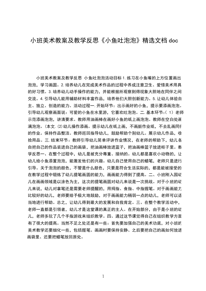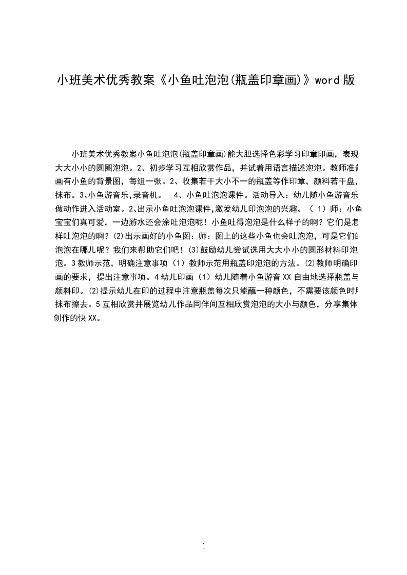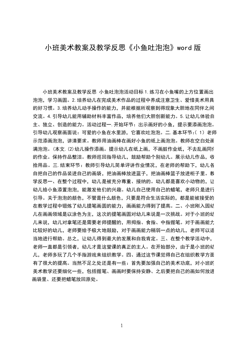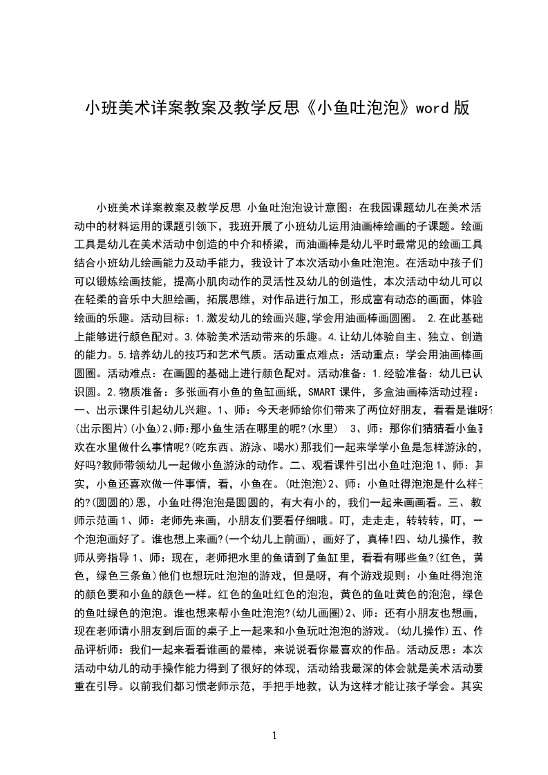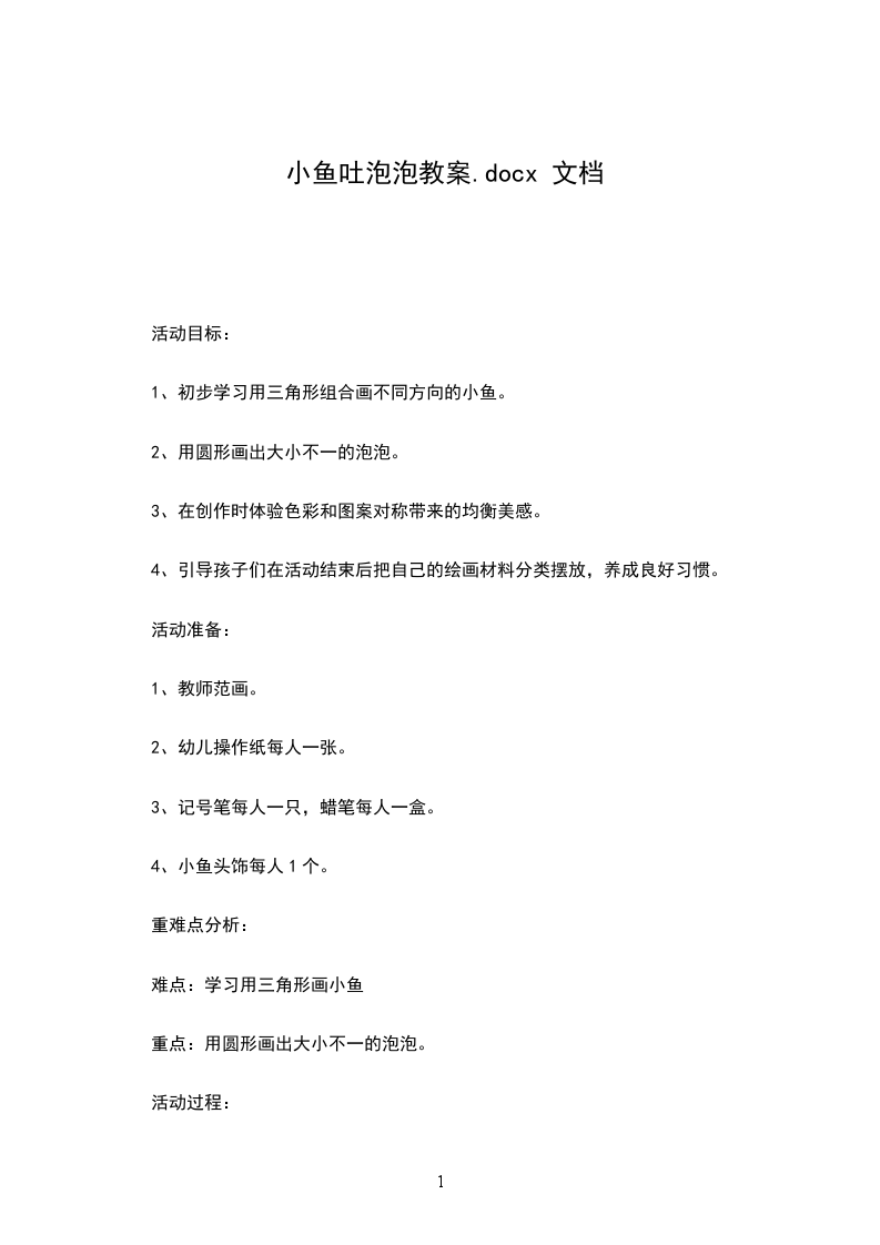 5.让幼儿体验自主、独立、创造的能力。活动过程一.开始环节:出示画好的小鱼,提示要添画泡泡。引导幼儿观察画面说:可爱的小鱼在水里游,它喜欢吐泡泡。二.基本环节: