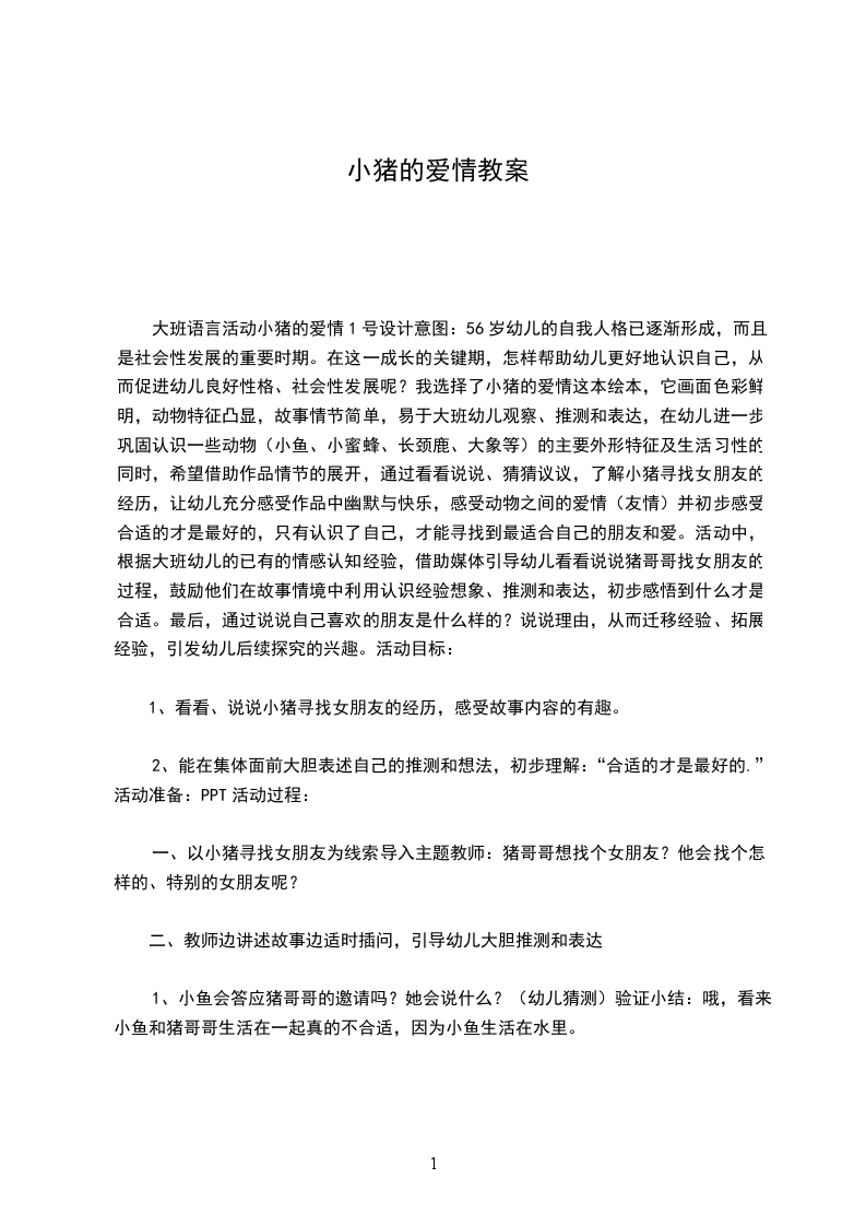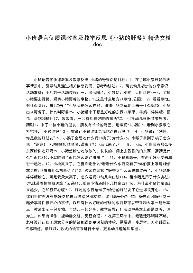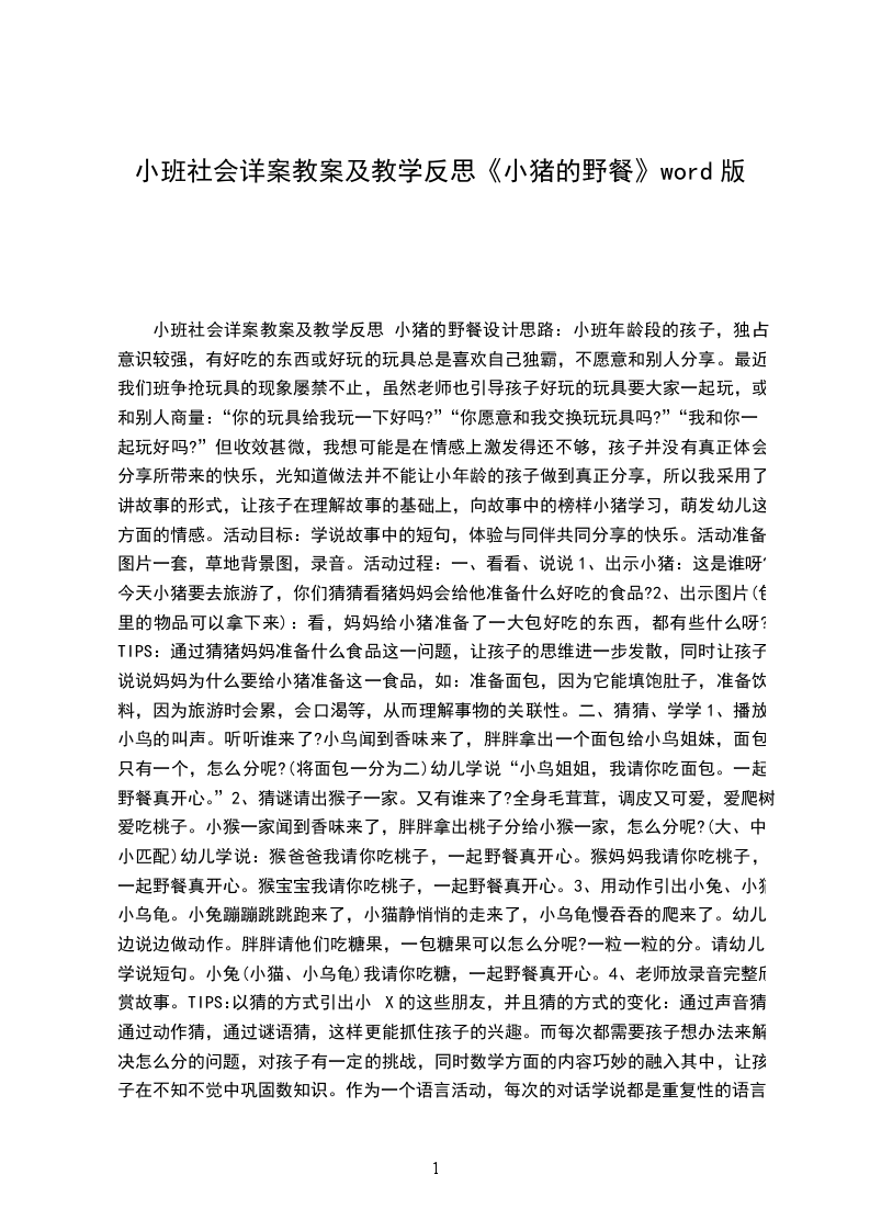 小班社会详案教案及教学反思 小猪的野餐设计思路:小班年龄段的孩子,独占意识较强,有好吃的东西或好玩的玩具总是喜欢自己独霸,不愿意和别人分享。最近我们班争抢玩具的现象屡禁不止,虽然老师也引导孩子好玩的玩具要大家一起玩,或和别人商量:“你的玩具给我玩一下好吗?”“你愿意和我交换玩玩具吗?”“我和你一起玩好吗?”但收效甚微,我想可能是在情感上激发得还不够,孩子并没有真正体会分享所带来的快乐,光知道做法并不能让小年龄的孩子做到真正分享,所以我采用了讲故事的形式,让孩子在理解故事的基础上,向故事中的榜样小猪学习,萌发幼儿这方面的情感。活动目标:学说故事中的短句,体验与同伴共同分享的快乐。活动准备:图片一套,草地背景图,录音。