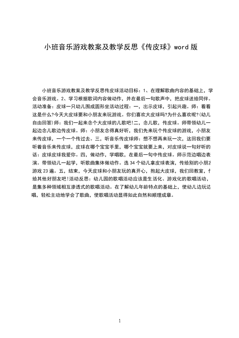 四、音乐游戏:小青蛙_在游戏中,要求幼儿听着音乐的节拍、拍准或踏准节奏。活动反思:小班歌曲有趣的大皮球的歌词和旋律都比较简单,比较适合小班幼儿的教学,而且在平时的活动中,幼儿对玩皮球很感兴趣。在歌曲的学唱过程中,选择与孩子们生活中喜爱的事物大皮球”相结合,整个活动在老师游戏口吻带动下,可以让孩子们的整个学唱过程显得更为生活化、更为游戏化。在教学活动的开始,我先让幼儿结合经验熟悉理解歌词,组织幼儿学习歌词“看小猫和小狗给我们带来了什么呀?大皮球长得什么样呀?你玩过皮球吗?皮球可以怎么玩呢?拍的时候会怎么样的?”鼓励幼儿结合经验说说,拍皮球的时候你有没有发现什么秘密呀?还边拍边问:为什么这个皮球一会跳的低一会跳的高呢?幼儿发现拍的轻球跳的低拍的重球跳的高,与此同时引导幼儿用做动作边用较轻和较响的声音念这几句歌词。由上可见,幼儿园的歌唱活动应该是生活化、游戏化的歌唱活动,是集多种领域相互渗透式的歌唱活动。我们可以通过以下几点优化歌唱活动教学组织: