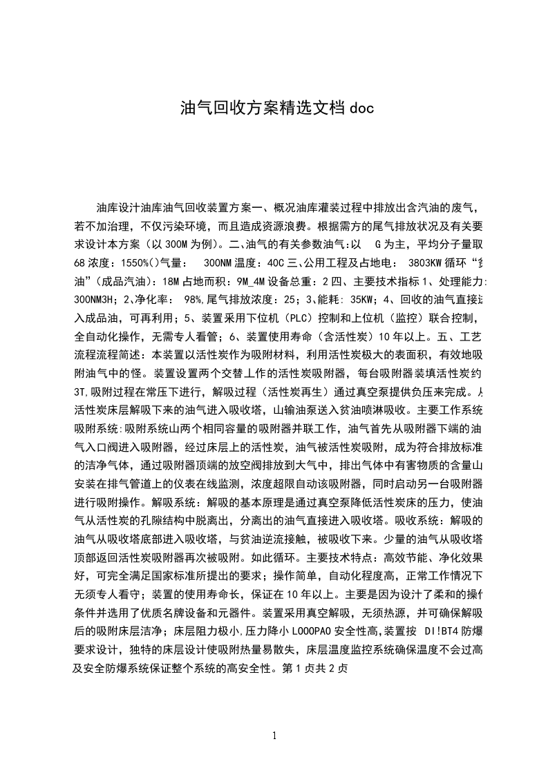一、概况油库灌装过程中排放出含汽油的废气,若不加治理,不仅污染环境,而且造成资源浪费。根据需方的尾气排放状况及有关要求设计本方案(以300M为例)。