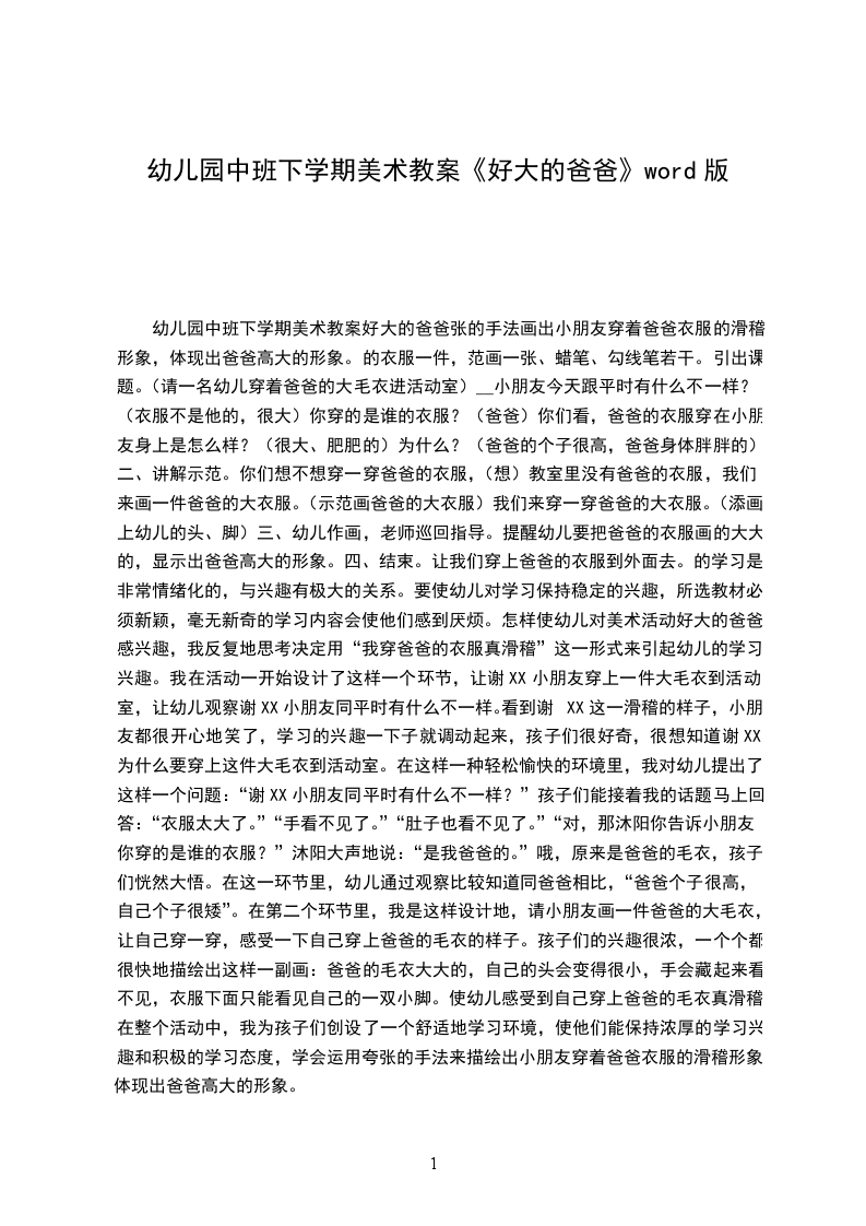 四、结束。让我们穿上爸爸的衣服到外面去。的学习是非常情绪化的,与兴趣有极大的关系。要使幼儿对学习保持稳定的兴趣,所选教材必须新颖,毫无新奇的学习内容会使他们感到厌烦。怎样使幼儿对美术活动好大的爸爸感兴趣,我反复地思考决定用“我穿爸爸的衣服真滑稽”这一形式来引起幼儿的学习兴趣。我在活动一开始设计了这样一个环节,让谢XX小朋友穿上一件大毛衣到活动室,让幼儿观察谢XX小朋友同平时有什么不一样。看到谢XX这一滑稽的样子,小朋友都很开心地笑了,学习的兴趣一下子就调动起来,孩子们很好奇,很想知道谢XX为什么要穿上这件大毛衣到活动室。在这样一种轻松愉快的环境里,我对幼儿提出了这样一个问题:“谢XX小朋友同平时有什么不一样?”孩子们能接着我的话题马上回答:“衣服太大了。”“手看不见了。”“肚子也看不见了。”“对,那沐阳你告诉小朋友你穿的是谁的衣服?”沐阳大声地说:“是我爸爸的。”哦,原来是爸爸的毛衣,孩子们恍然大悟。在这一环节里,幼儿通过观察比较知道同爸爸相比,“爸爸个子很高,自己个子很矮”。在第二个环节里,我是这样设计地,请小朋友画一件爸爸的大毛衣,让自己穿一穿,感受一下自己穿上爸爸的毛衣的样子。孩子们的兴趣很浓,一个个都很快地描绘出这样一副画:爸爸的毛衣大大的,自己的头会变得很小,手会藏起来看不见,衣服下面只能看见自己的一双小脚。使幼儿感受到自己穿上爸爸的毛衣真滑稽。在整个活动中,我为孩子们创设了一个舒适地学习环境,使他们能保持浓厚的学习兴趣和积极的学习态度,学会运用夸张的手法来描绘出小朋友穿着爸爸衣服的滑稽形象,体现出爸爸高大的形象。