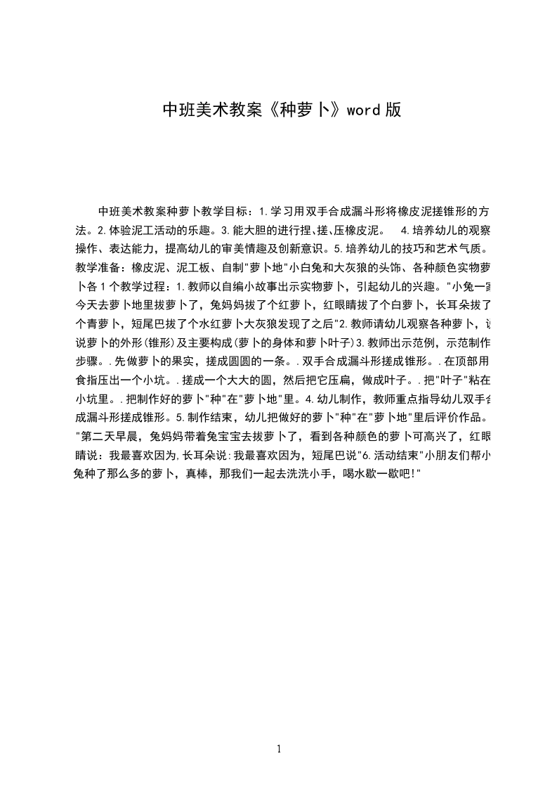 5.培养幼儿的技巧和艺术气质。教学准备:橡皮泥、泥工板、自制"萝卜地"小白兔和大灰狼的头饰、各种颜色实物萝卜各1个教学过程: