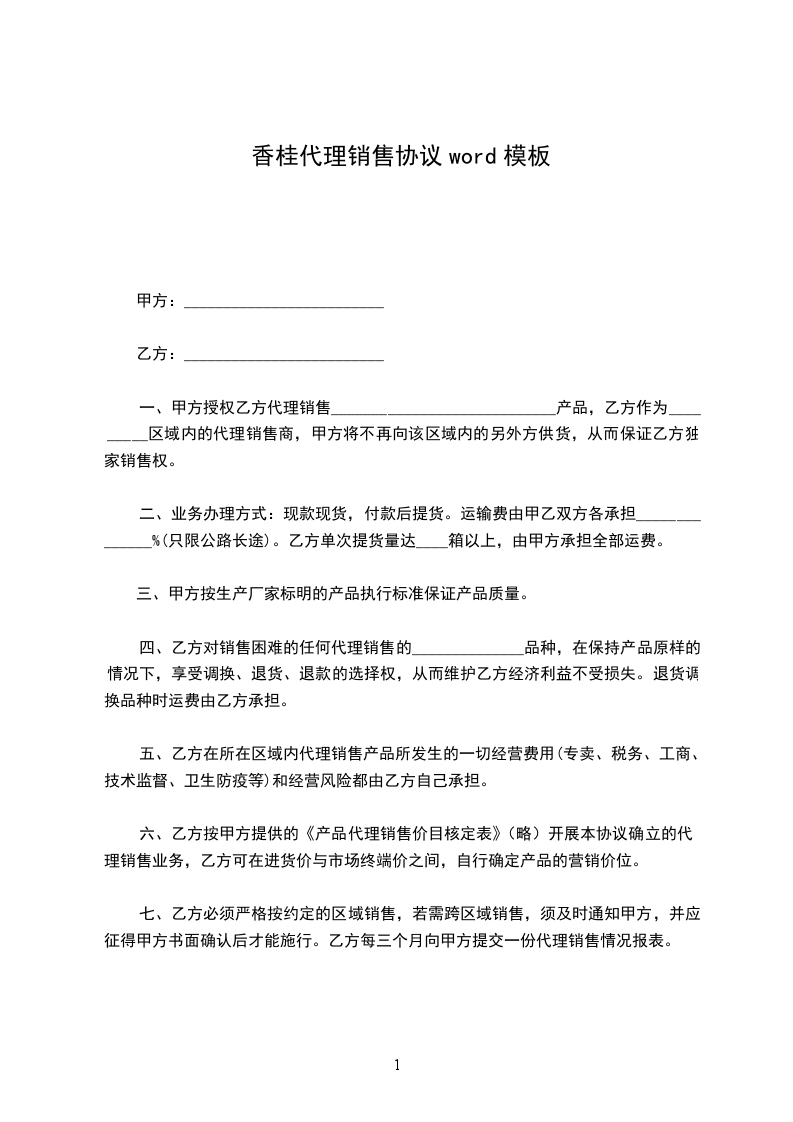 一、甲方授权乙方代理销售____________________________产品,乙方作为_________区域内的代理销售商,甲方将不再向该区域内的另外方供货,从而保证乙方独家销售权。