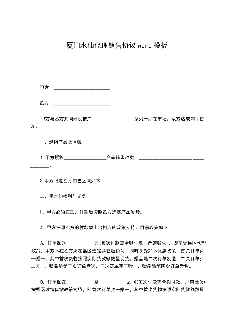 B,订单额在____________至____________之间(每次付款需全额付款,严禁赊欠)按照区域销售站政策对待,即首次订单买一赠一,其中首次货物按照实际货款额数量发货,赠品随二次订单发送,二次订单买二送一,赠品随第三次订单发送,三次订单买三赠一,赠品随第四次订单发货。甲方可以在乙方所在县区建立新的销售站。