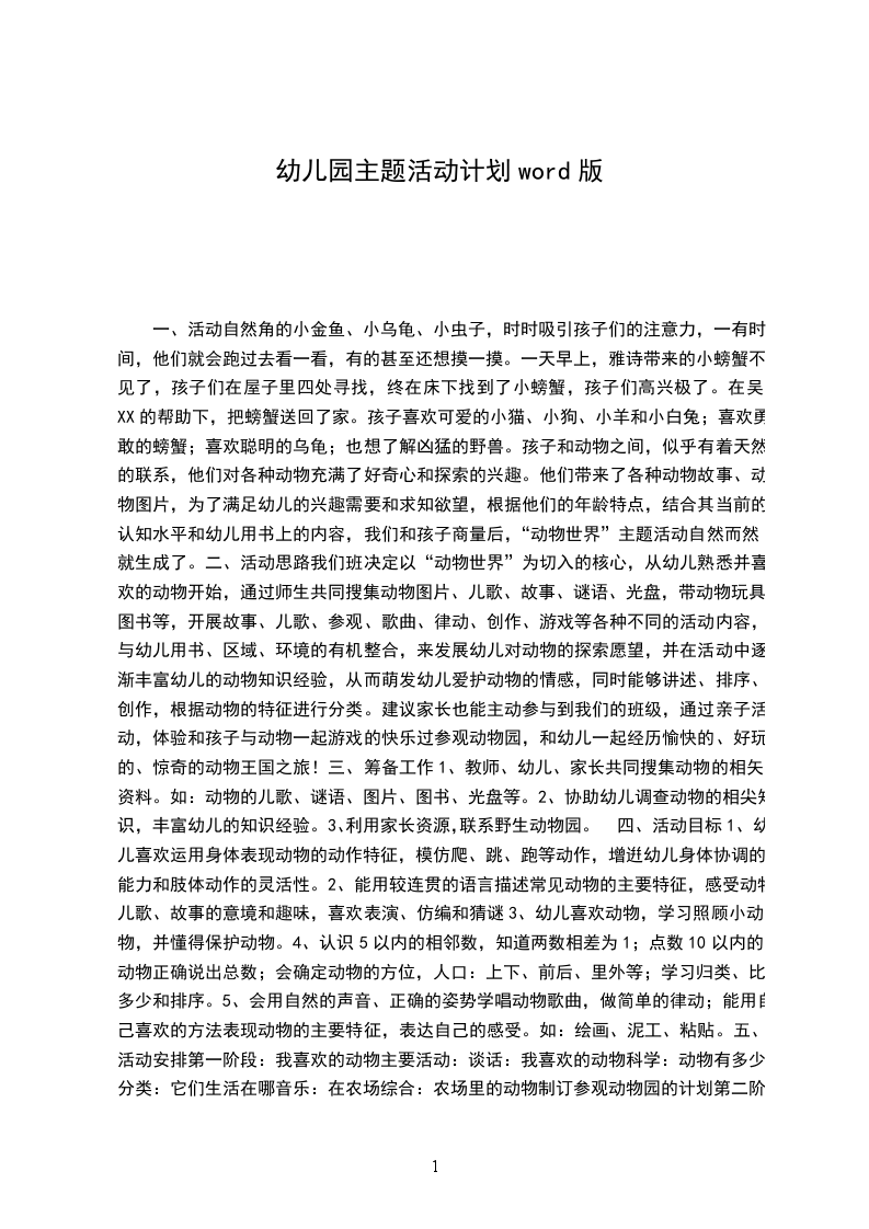 五、活动安排第一阶段:我喜欢的动物主要活动:谈话:我喜欢的动物科学:动物有多少分类:它们生活在哪音乐:在农场综合:农场里的动物制订参观动物园的计划第二阶段:动物本领大主要活动:区域:搭建野生动物园探究:有用的鼻子尾巴的功能故事:龟兔赛跑小壁虎借尾巴健康:跳远比赛科学:小动物找家科学:动物分类第三阶段:动物用处大主要活动:动物用处大胎生和卵生找妈妈第四阶段:保护动物方法多主要活动:综合:保护动物设计意图冬天大雪纷飞,打雪仗,堆雪人,这些奇妙的景色,有趣的户外活动,会弓I起幼儿极大的好奇和兴趣,我们正是利用这神奇的自然现象作为引球,开展以冬天为主题的活动。用各种形式激发幼儿从动脑,动口动手,使其在丰富的自然科学的同时培养其对物的分类统计的能力,及对艺术的表现能力,并锻炼他们的意志,陶冶他们对大自然的热爱之情。活动目标