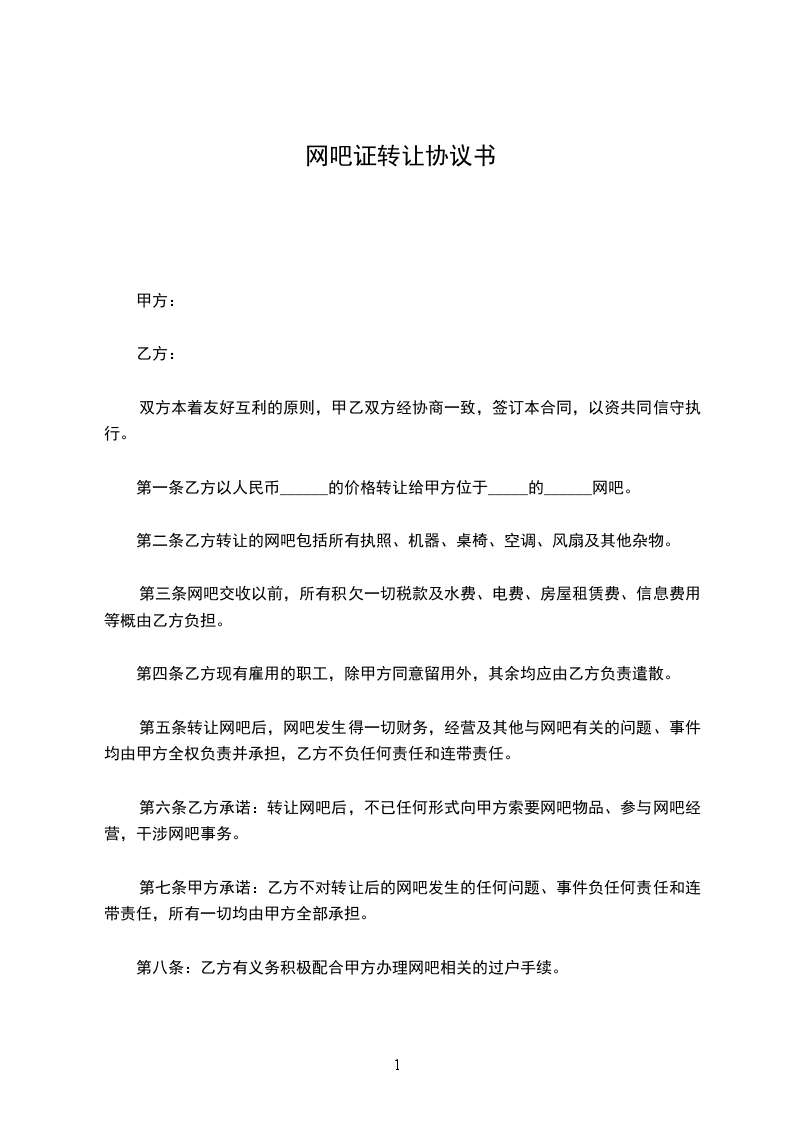 第一条乙方以人民币______的价格转让给甲方位于_____的______网吧。