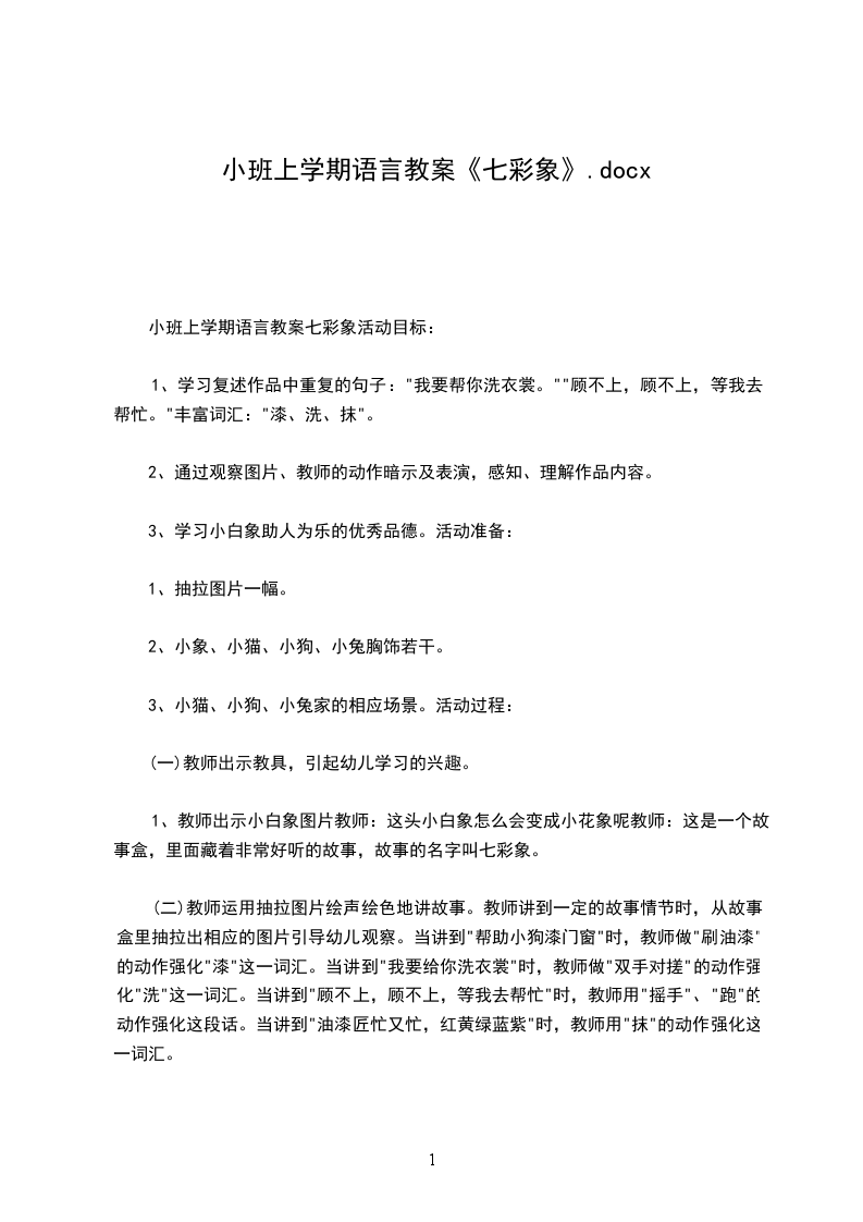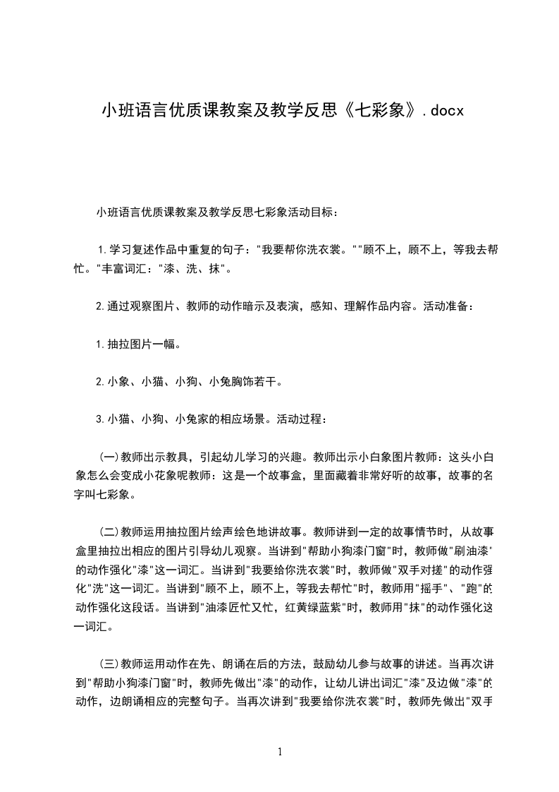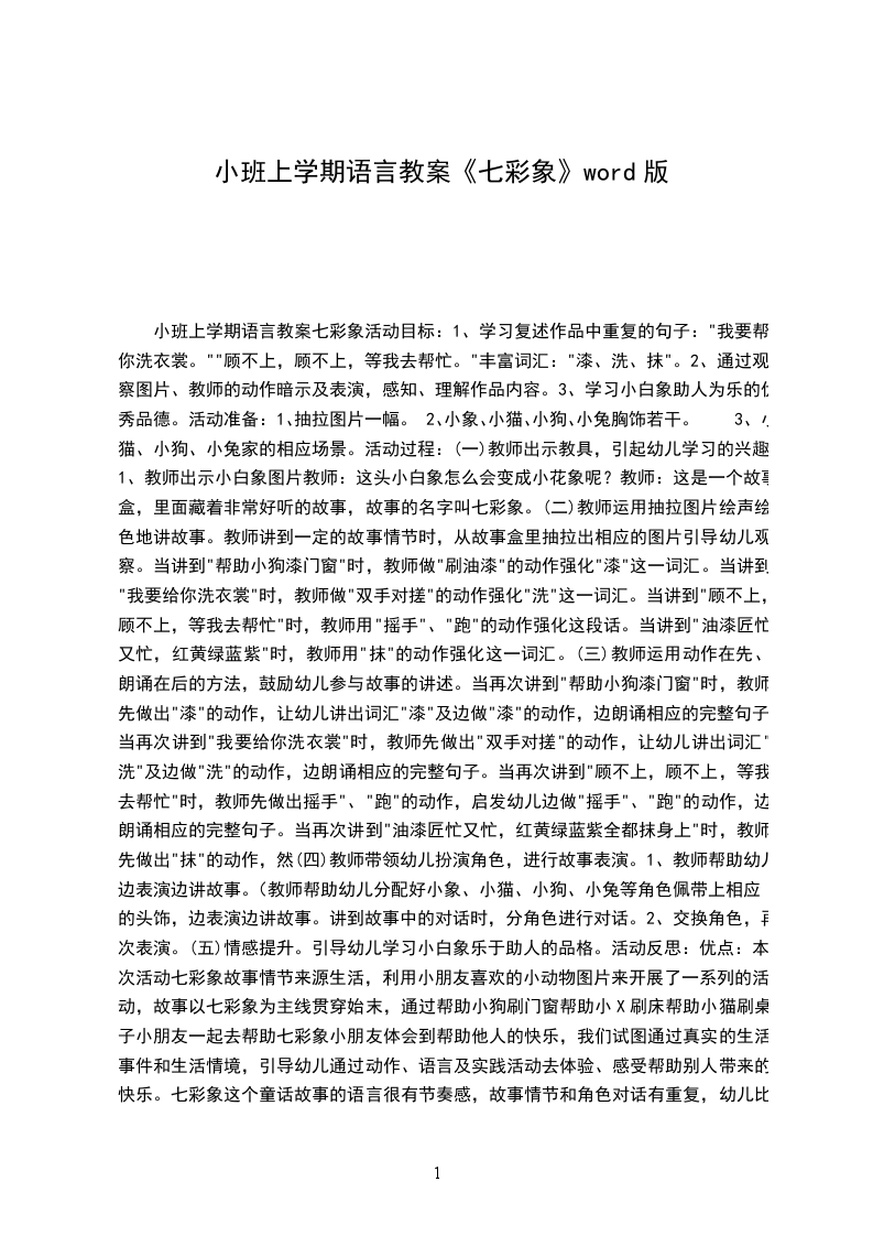 (五)情感提升。引导幼儿学习小白象乐于助人的品格。活动反思:优点:本次活动七彩象故事情节来源生活,利用小朋友喜欢的小动物图片来开展了一系列的活动,故事以七彩象为主线贯穿始末,通过帮助小狗刷门窗帮助小X刷床帮助小猫刷桌子小朋友一起去帮助七彩象小朋友体会到帮助他人的快乐,我们试图通过真实的生活事件和生活情境,引导幼儿通过动作、语言及实践活动去体验、感受帮助别人带来的快乐。七彩象这个童话故事的语言很有节奏感,故事情节和角色对话有重复,幼儿比较容易学说故事中的对话。分析:课一开始教师出示干净的小白象图片和身上有五颜六色油漆的小象的图片,有一个小白象,他变成了七彩象,你们猜一猜他怎么会变成七彩象的?小朋友猜了很多,有的说是摔跤了,身上弄脏了,有说被太阳照的,有的说把蜡笔涂在身上了。带着孩子们的好奇,迫不及待想知道答案,紧接着就开始讲故事,在我讲了一遍以后问他们小白象是怎么变成七彩象,他们一点反应也没有,答案还是停留在刚才的猜测的问题中,是我就讲第二遍故事,采用一边看图片一边来讲故事。这下子他们的眼睛全盯住我和我手中的图片了,还能跟着我做动作,就这样他们很安静地听我讲完了故事,对故事也有了大概的了解,在第二遍以后就能复述故事了。还能和我一起说:顾不上,顾不上,___等我去帮忙。但是,对于这个问题"小白象怎么会变成七彩象的"还是似懂非懂。调整策略: