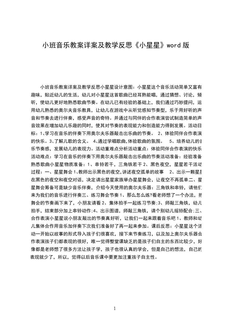 小班音乐教案详案及教学反思小星星设计意图:小星星这个音乐活动简单又富有趣味,贴近幼儿的生活,幼儿对小星星这首歌曲已经耳熟能唱,通过猜想、讨论,倾听,使幼儿更好地熟悉歌曲节奏。在幼儿已有经验的基础上,我们通过巧妙提问,运用幼儿熟悉的奥尔夫音乐教具,让幼儿在游戏中从听觉感知节奏型,乐于用好听的声音和节奏去进行伴奏,感受声音的奇特。并通过与同伴的合作表演尝试制造简单的声音效果在增加幼儿乐趣的同时,使其对节奏的表现能力和创造能力得到发展。活动目标: