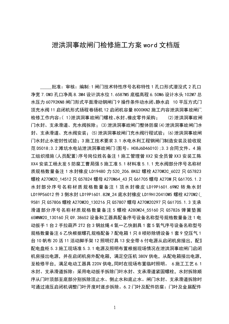 6.50M6设计水头102M7总水压力60792KN8闸门形式平面滑动钢闸门9操作条件动水闭、静水启10平压方式门顶充水阀11启闭机形式扬程卷扬机12启闭机容量8000KN2施工内容泄洪洞事故闸门检修工作内容: