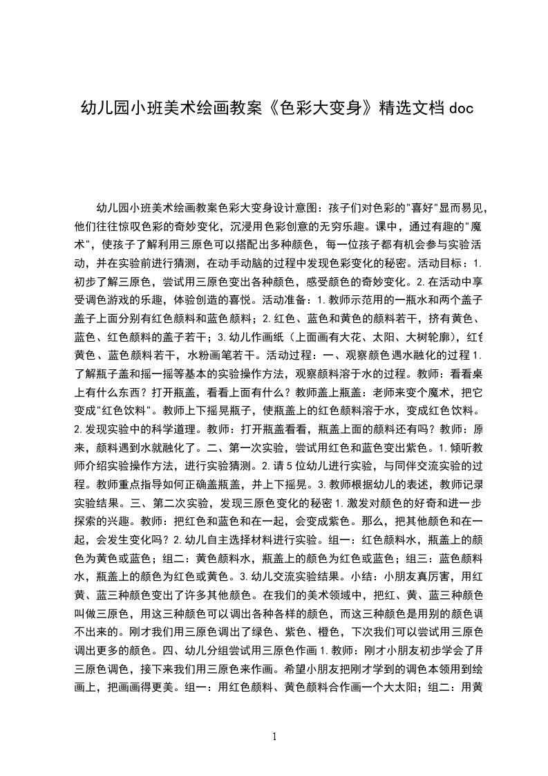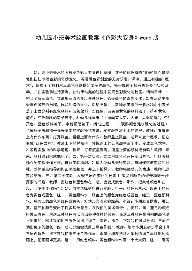 幼儿园小班美术绘画教案色彩大变身设计意图:孩子们对色彩的"喜好"显而易见,他们往往惊叹色彩的奇妙变化,沉浸用色彩创意的无穷乐趣。课中,通过有趣的"魔术",使孩子了解利用三原色可以搭配出多种颜色,每一位孩子都有机会参与实验活动,并在实验前进行猜测,在动手动脑的过程中发现色彩变化的秘密。活动目标: