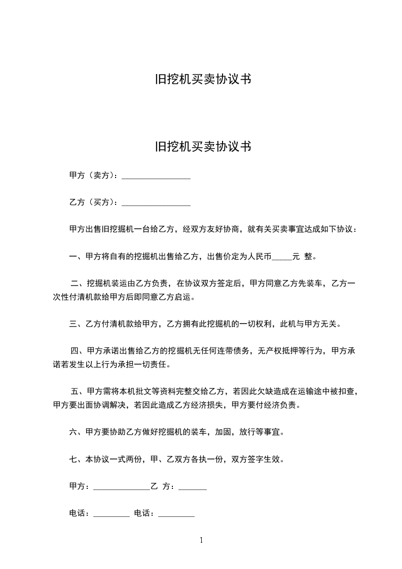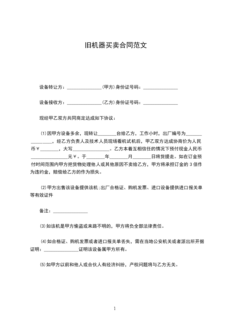 (1)因甲方设备多余,现转让________台给乙方,工作小时,出厂编号为________________,经乙方负责人及技术人员现场看机试机后,甲乙双方达成协商价为人民币¥________,大写________________。乙方本着互相信任的情况下预付现金人民币________________元¥。于________年________月________日将货提走。如在订金预付时间范围内甲方把货物处理他人或其他原因不卖给乙方,甲方将承担订金的3倍作为违约金,赔偿给乙方的作为损失。