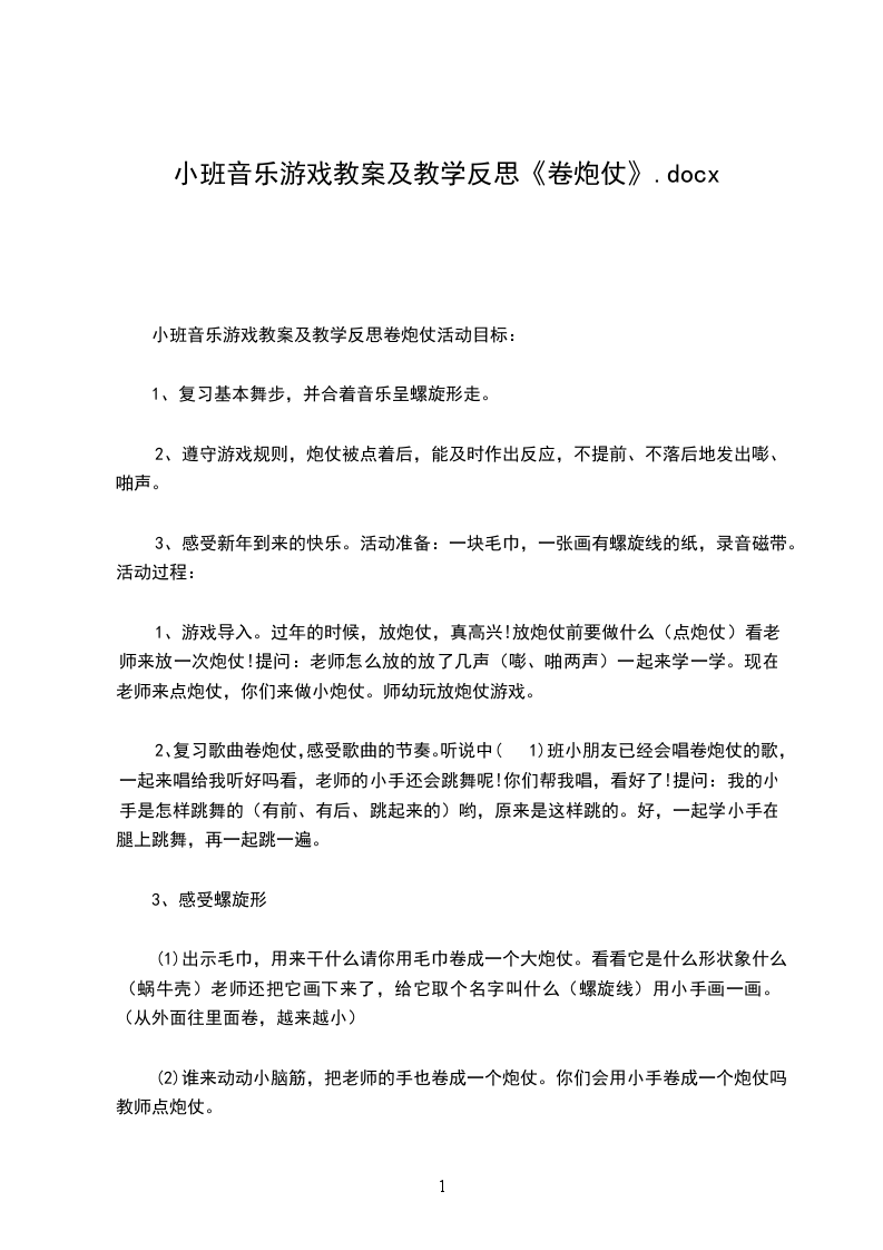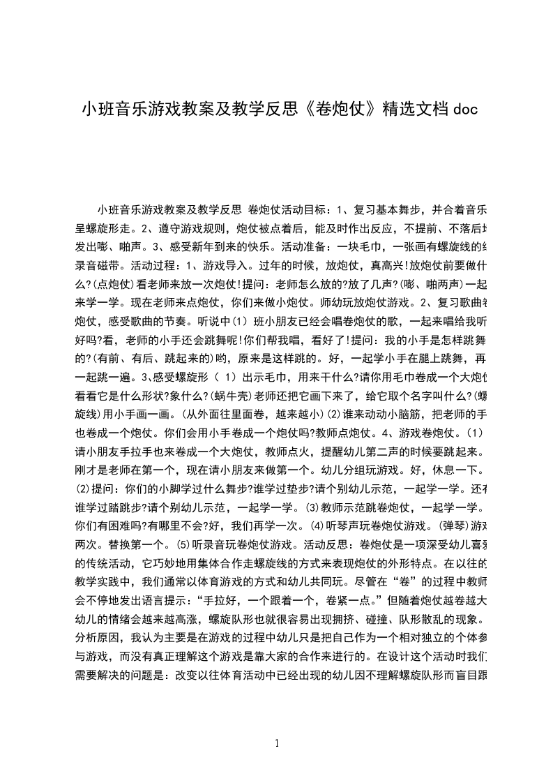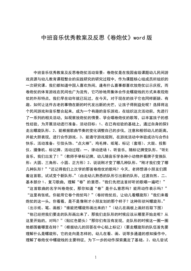 中班音乐优秀教案及反思卷炮仗活动背景:卷炮仗是在我园省级课题幼儿民间游戏资源与幼儿教育课程整合的实践研究的研究过程中,作为课题核心组成员所组织的一次研究课。我们都知道中国人喜欢热闹,逢有什么喜事都喜欢放炮仗以示庆祝,而卷炮仗的体育游戏在民间也广为流传,它巧妙地用集体合作走螺旋线的方式来表现炮仗的外形特点,我们早在幼年就已玩过,在今天,对于现在的孩子它也同样新颖、有趣。如何让这件古老的事物在新的时代发出新的光芒,让孩子得到益处呢?选择将这个民间游戏和音乐整合起来,成为一个有趣的音乐游戏。在组织这次活动前,先进行了一系列的相关活动,如观察放炮仗的情景、学会唱卷炮仗的歌等,以丰富孩子的感性经验,为开展活动进行准备。活动目标: