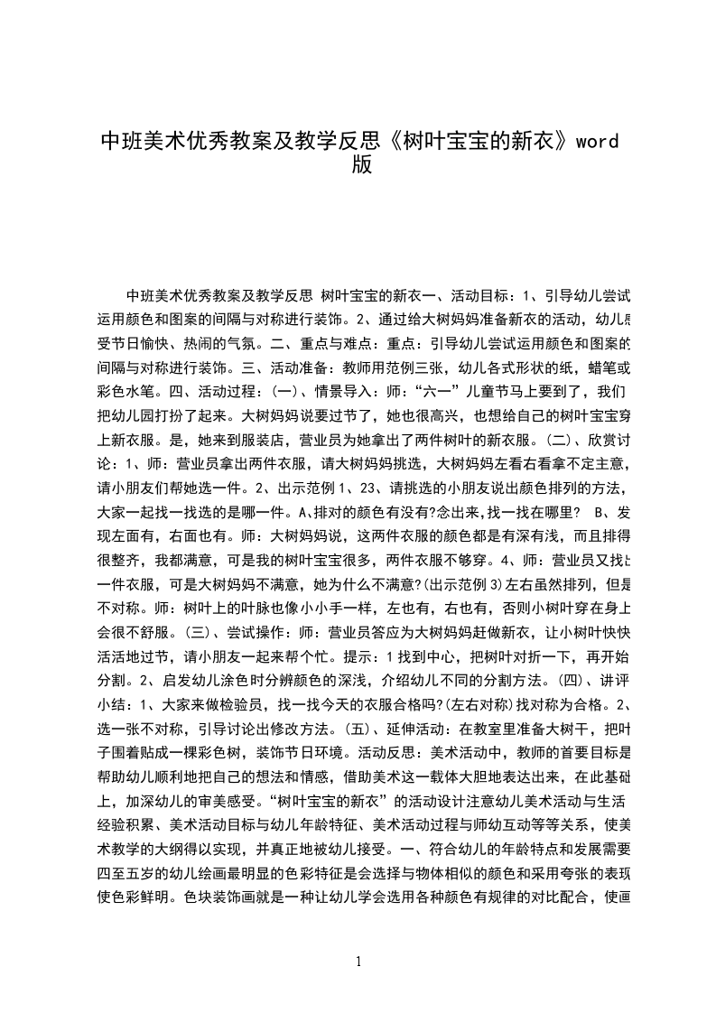 (五)、延伸活动:在教室里准备大树干,把叶子围着贴成一棵彩色树,装饰节日环境。活动反思:美术活动中,教师的首要目标是帮助幼儿顺利地把自己的想法和情感,借助美术这一载体大胆地表达出来,在此基础上,加深幼儿的审美感受。“树叶宝宝的新衣”的活动设计注意幼儿美术活动与生活经验积累、美术活动目标与幼儿年龄特征、美术活动过程与师幼互动等等关系,使美术教学的大纲得以实现,并真正地被幼儿接受。