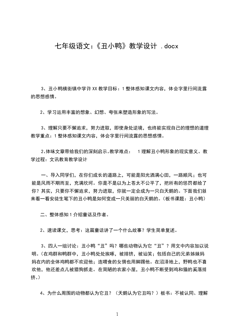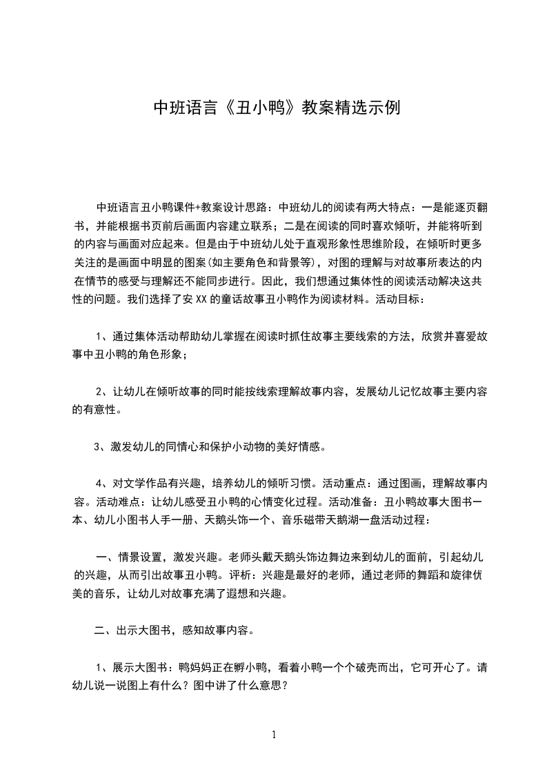 中班上学期语言教案丑小鸭活动目标