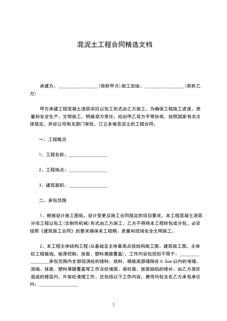 甲方承建工程混凝土浇筑项目以包工形式由乙方施工。为确保工程施工进度、质量和安全生产、文明施工,明确双方责任,经由甲乙双方平等协商,按照国家有关法律规定,并经公司有关部门审批,订立本做混泥土的工程合同。