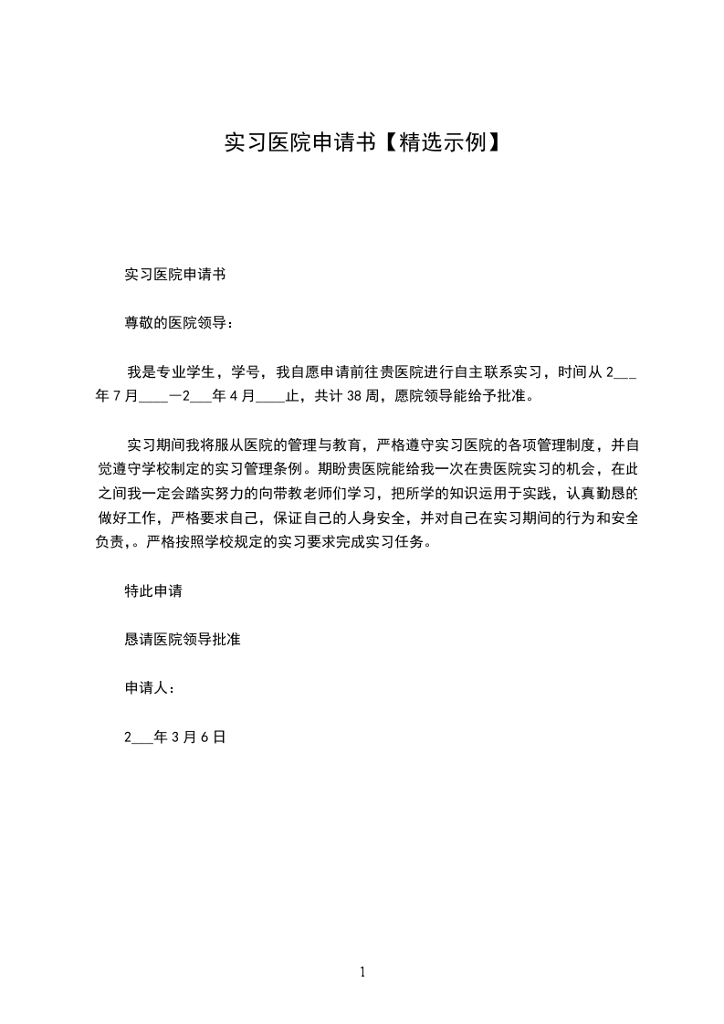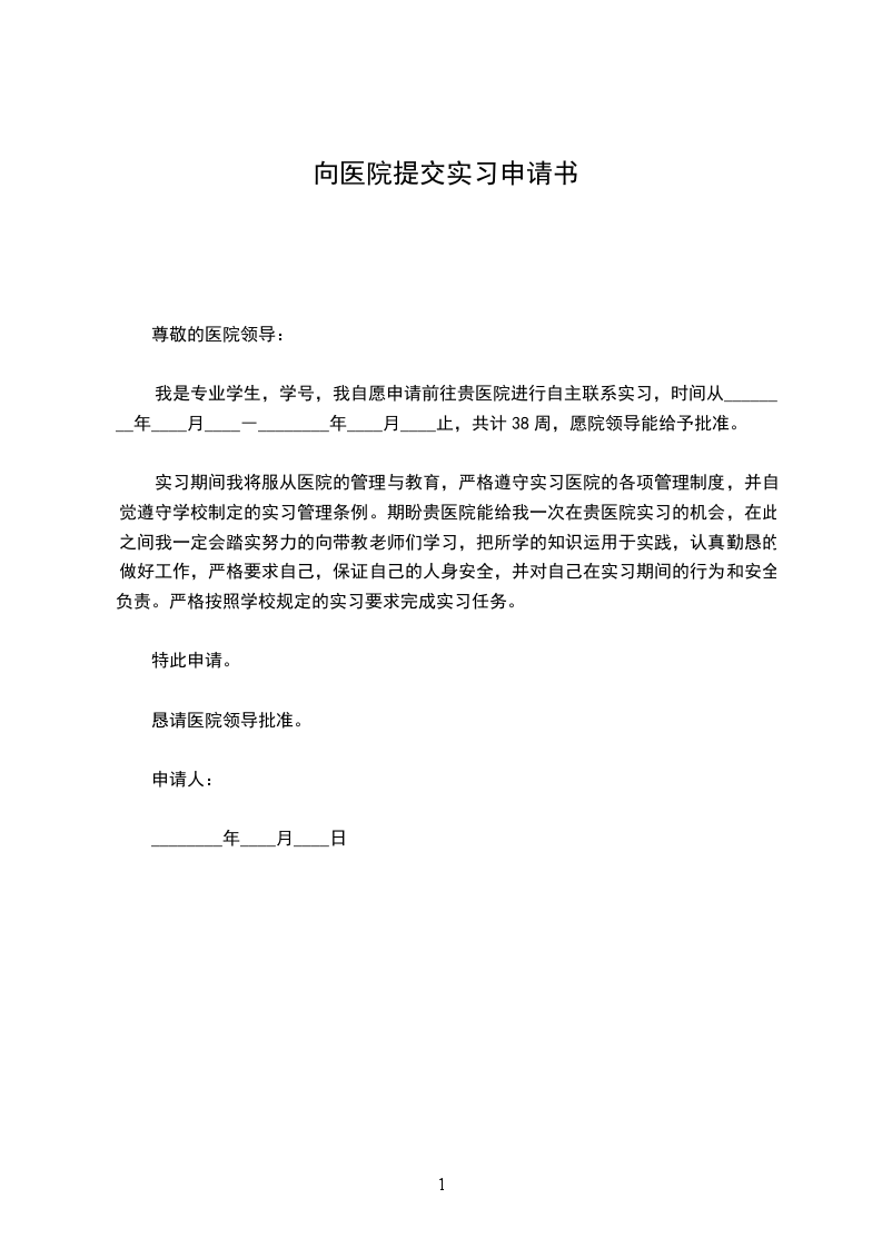 我是专业学生,学号,我自愿申请前往贵医院进行自主联系实习,时间从________年____月____―________年____月____止,共计38周,愿院领导能给予批准。