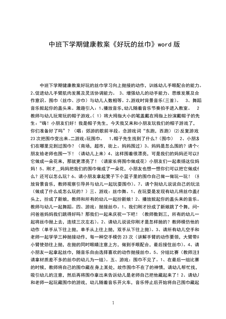 中班下学期健康教案好玩的丝巾学习向上抛接的动作,训练幼儿手眼配合的能力。