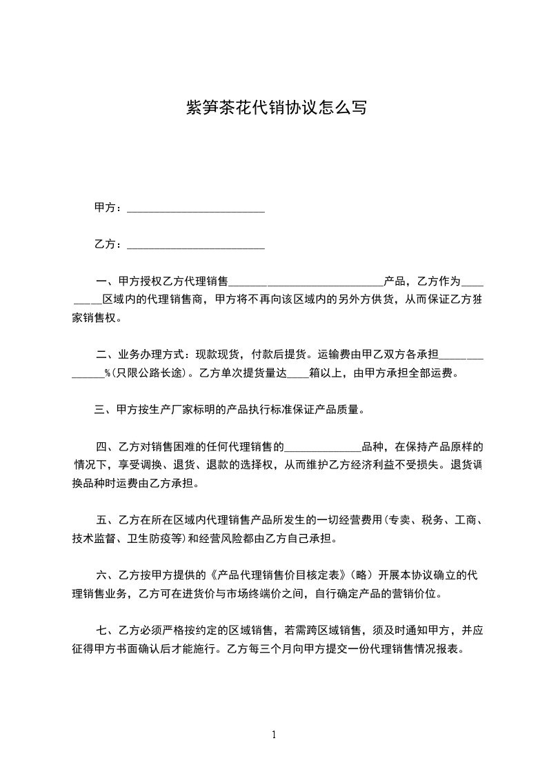 一、甲方授权乙方代理销售____________________________产品,乙方作为_________区域内的代理销售商,甲方将不再向该区域内的另外方供货,从而保证乙方独家销售权。