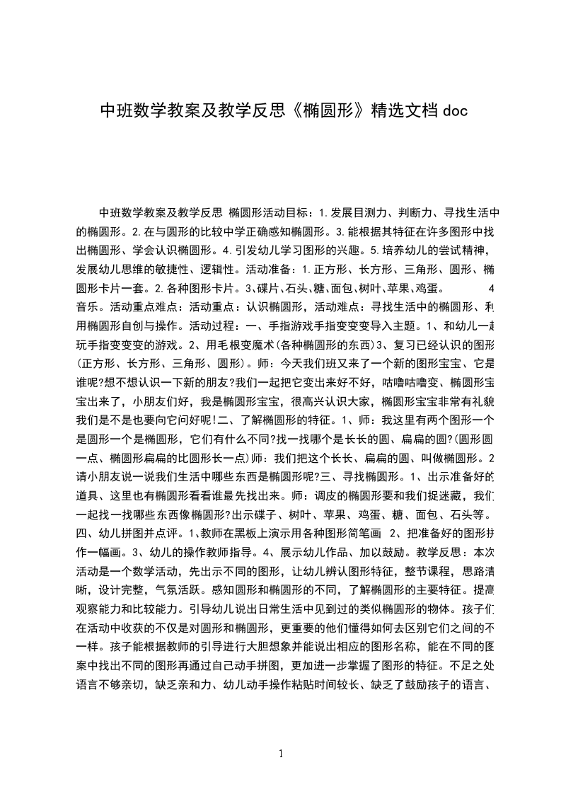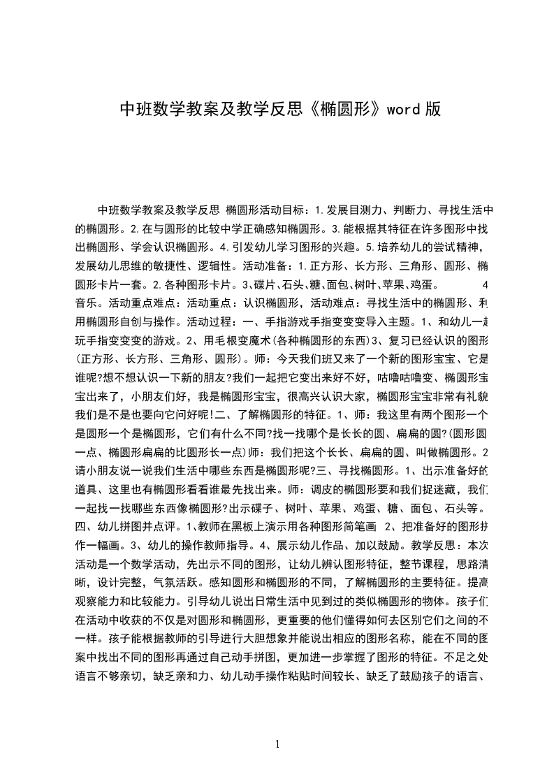 4、展示幼儿作品、加以鼓励。教学反思:本次活动是一个数学活动,先出示不同的图形,让幼儿辨认图形特征,整节课程,思路清晰,设计完整,气氛活跃。感知圆形和椭圆形的不同,了解椭圆形的主要特征。提高观察能力和比较能力。引导幼儿说出日常生活中见到过的类似椭圆形的物体。孩子们在活动中收获的不仅是对圆形和椭圆形,更重要的他们懂得如何去区别它们之间的不一样。孩子能根据教师的引导进行大胆想象并能说出相应的图形名称,能在不同的图案中找出不同的图形再通过自己动手拼图,更加进一步掌握了图形的特征。不足之处:语言不够亲切,缺乏亲和力、幼儿动手操作粘贴时间较长、缺乏了鼓励孩子的语言、看到幼儿不能在规定的时间内完成作品,便非常的无措,对个别幼儿的指导不够、语言不精炼,需要改进的地方很多、还要多加学习。