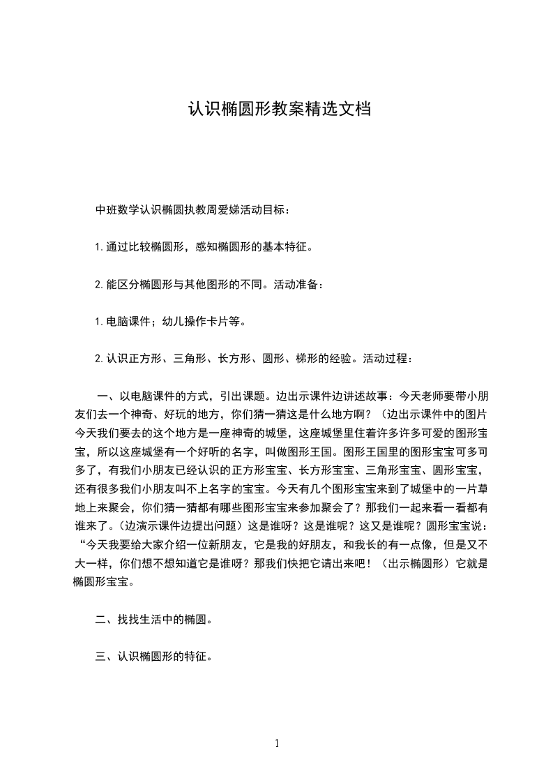 3、复习已经认识的图形(正方形、长方形、三角形、圆形)。师:今天我们班又来了一个新的图形宝宝、它是谁呢?想不想认识一下新的朋友?我们一起把它变出来好不好,咕噜咕噜变、椭圆形宝宝出来了,小朋友们好,我是椭圆形宝宝,很高兴认识大家,椭圆形宝宝非常有礼貌、我们是不是也要向它问好呢!