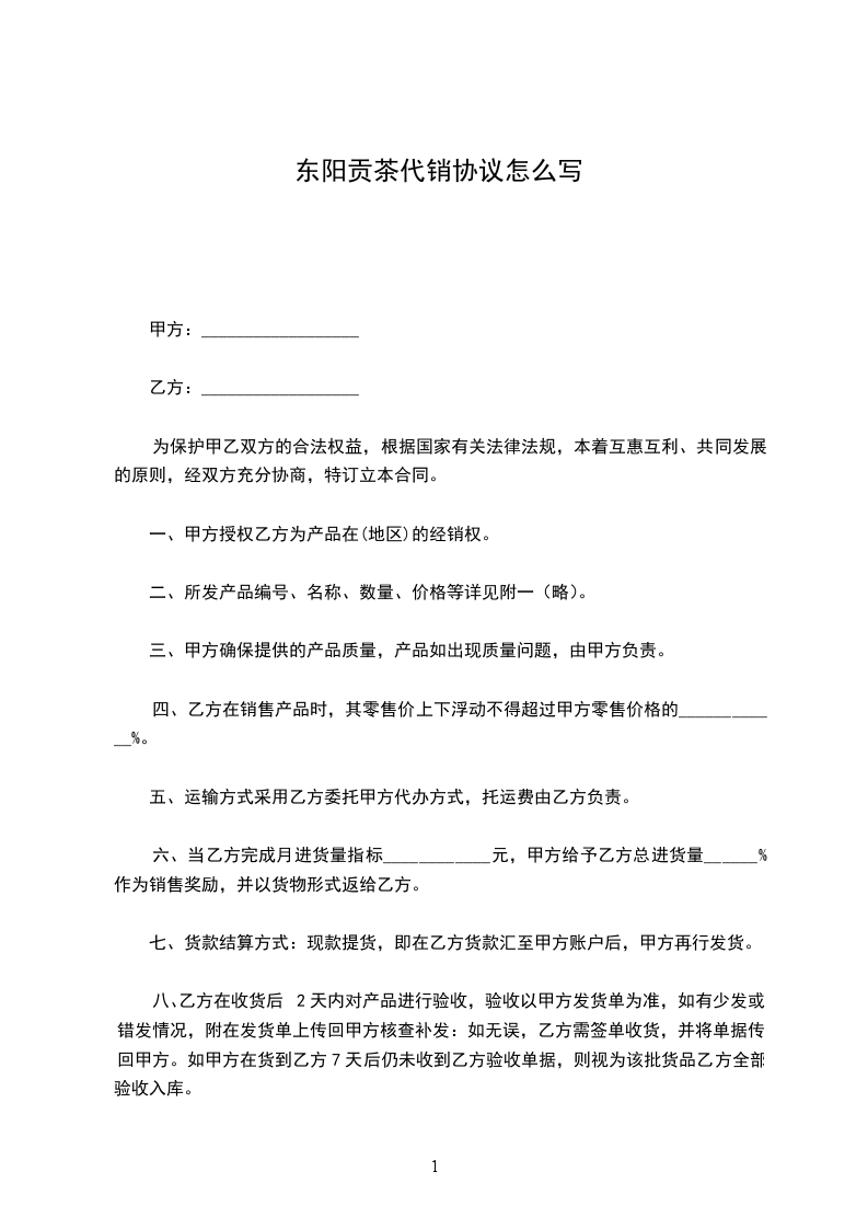 一、甲方授权乙方为产品在(地区)的经销权。